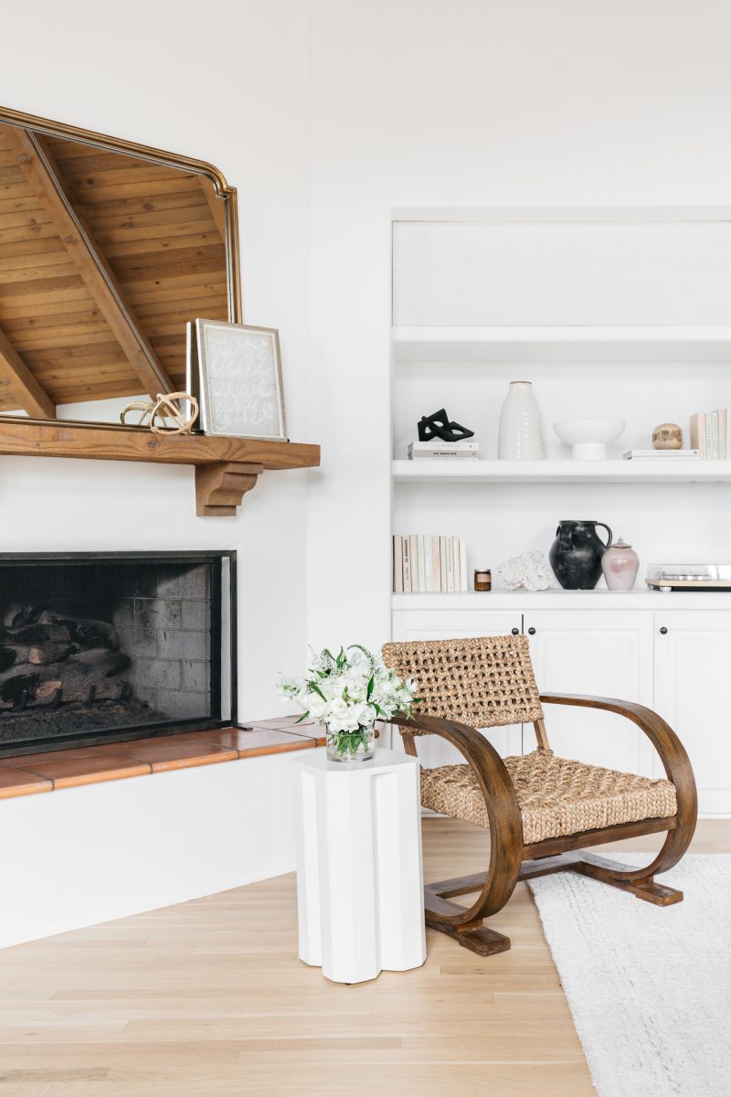 Piles of throw pillows striped with tan and darker gray kept the palette warm and the space inviting while adding contrast to the plush gray couch. Mixing and matching similar patterns within the same color palette helped create more interest without making the room look too busy. To bring a natural element to the space, Shelby brought in a pair of woven wooden chairs for either side of the coffee table. They add a touch of bohemian flair and reflect the wood beam ceiling. “I absolutely love the Lulu and Georgia wooden accent chairs and the Citizenry pillows on the sofa,” Becca exclaimed.