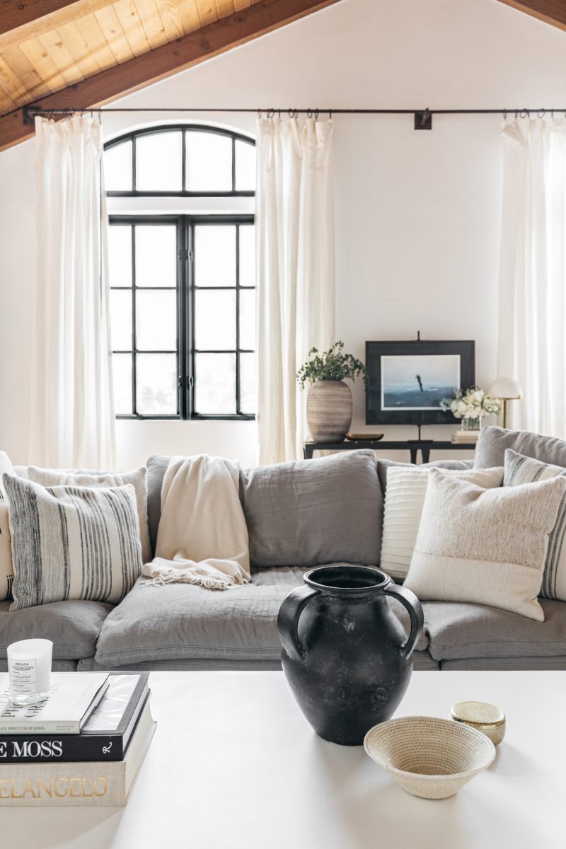 Becca’s light-filled living room is full of windows. Instead of covering them up with shutters or blinds, off-white white linen drapes enhance the natural light of the space while allowing for a bit more privacy. To completely cover the two symmetrical windows, Shelby advised Becca to hang the curtains from a long rod extending the span of the back wall.