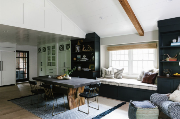 A round table is perfect for tucking into the corner. Try pulling up painted wooden chairs to a circular metal table and scooching it in closer to the built-ins. Cushion the benches for added comfort and add an assortment of patterned throw pillows to further accent the style of the space.