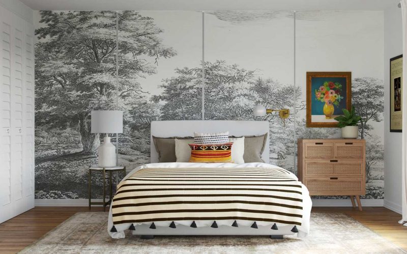 Set the stage for impact in the bedroom with a striking, statement wallpaper. From there, you can mix and match styles across different elements of the bedroom. Try low-profile mismatching nightstands in neutral tones juxtaposed with a simple rustic bed frame and solid drape that doesn’t take too much attention away from the show-stopping wall.