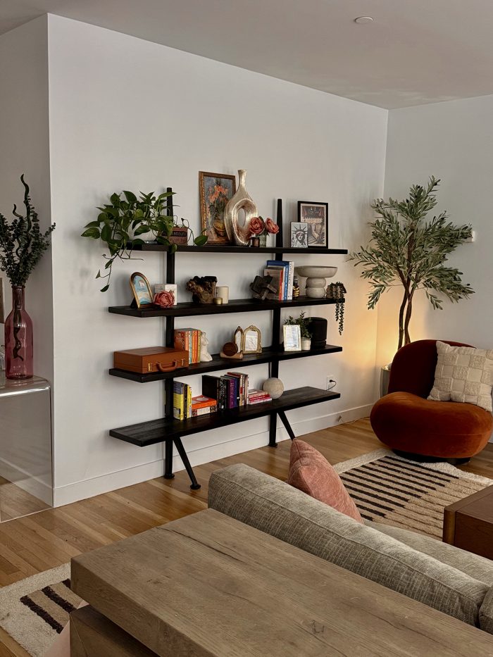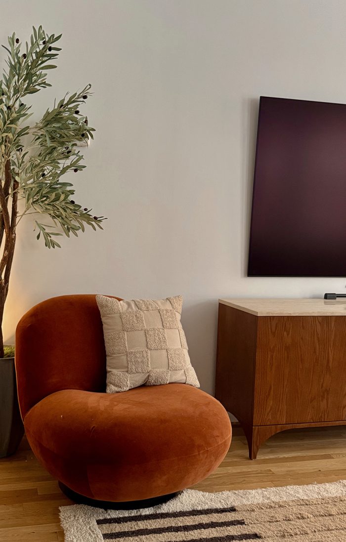 To set a foundation for the design direction, Neha and Katie decided on mid-century modern as the base style, incorporating rich walnut tones, pops of olive and rust, and clean silhouettes. From there, they layered in feminine touches — like a playful pink table lamp and sculptural details — to make it feel “personal and fun,” adds Neha.