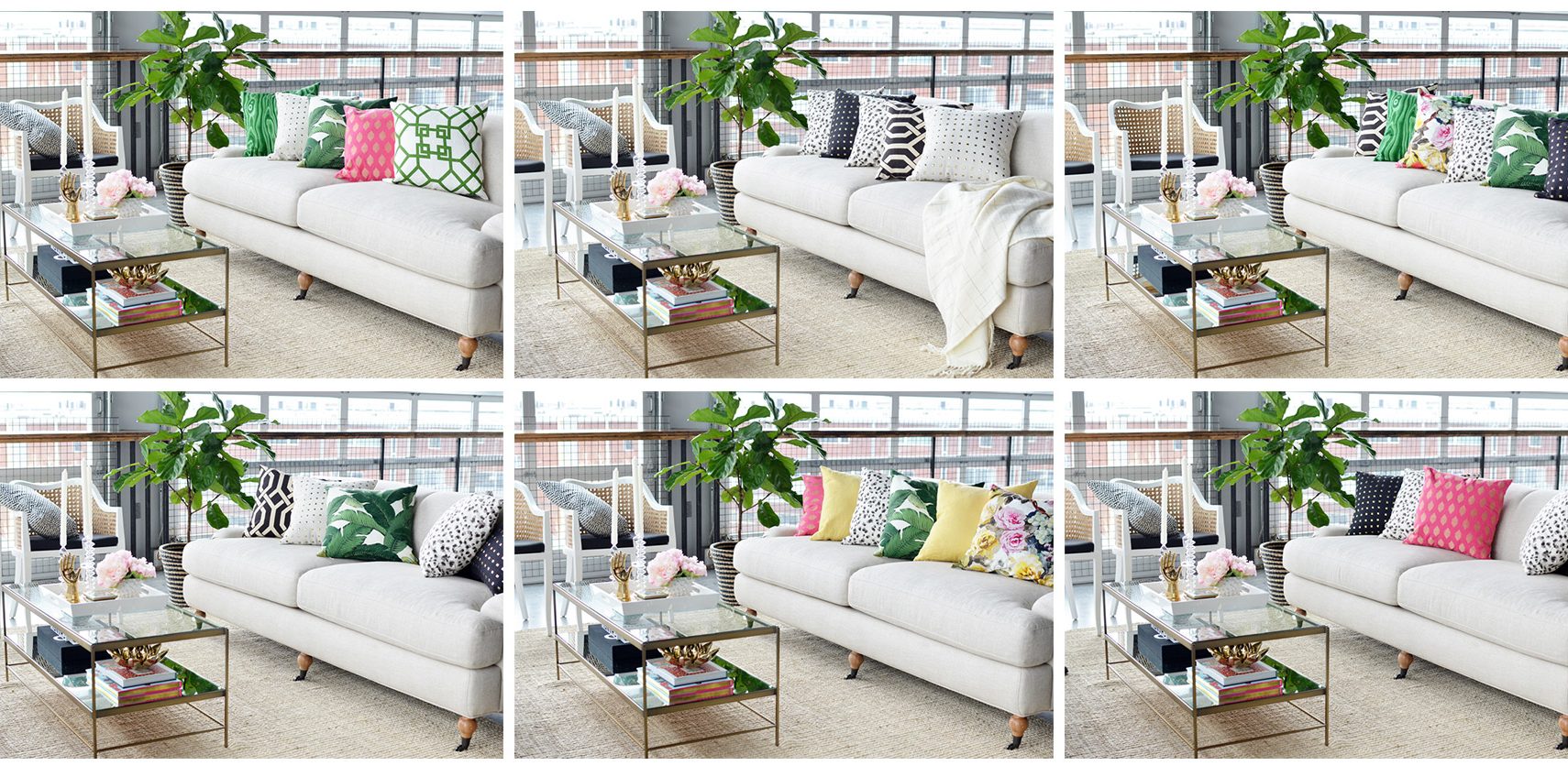 That’s right, using the nine Loom Decor pillows below, we’ve arrived at six delightful arrangements to spruce up any sofa.