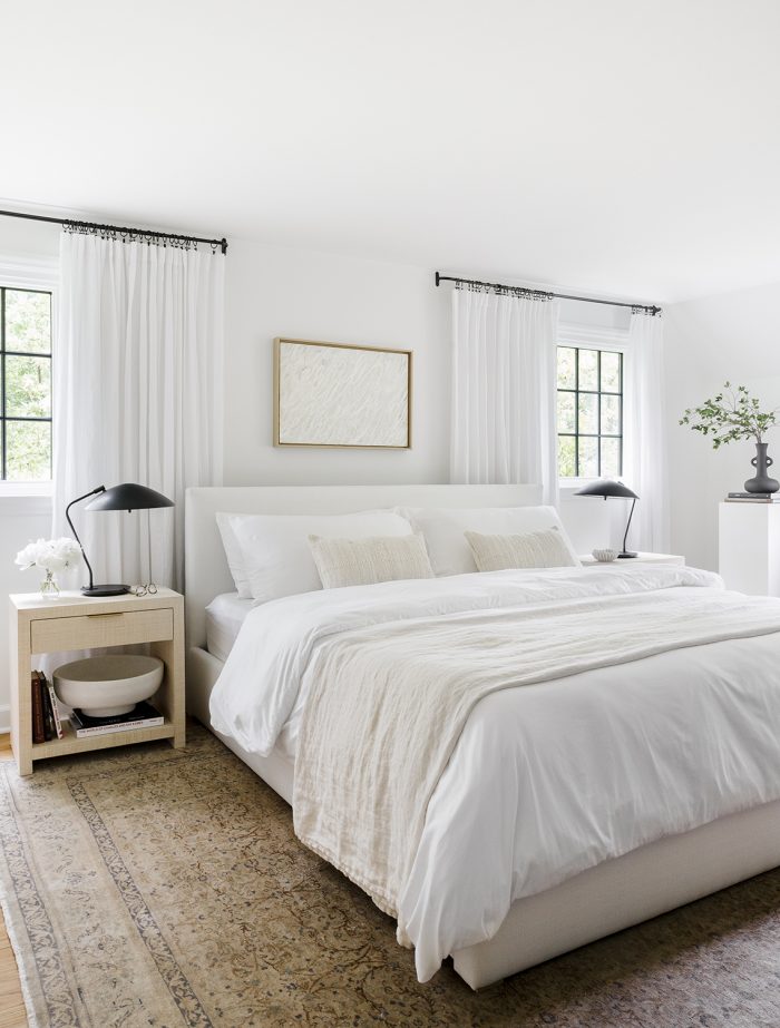 Desiring a bit more moodiness and depth in her primary bedroom, Shelby kept the neutral bones and added drama with brown drapery, a wooden four-poster bed, a deep olive green area rug, and layered bedding from The Citizenry and St. Frank. The end result is just as classic as the first iteration, but leans a bit more storied and vintage-inspired.