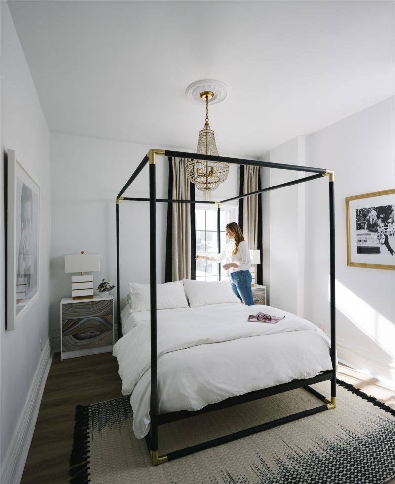 Slipcovered Bed Talc Linen // Viola Chandelier // Ida Dresser