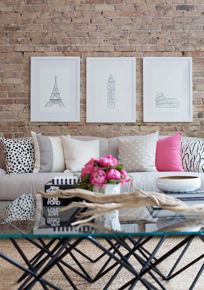 The lovely light gray sofa provides a nice neutral base for a myriad of patterned pillows. A pop of pink (one solitary fuchsia pillow- we see you!) keeps things fun and playful. The natural-weave area rug (sisal? pretty sure…) grounds the room while the modern/ architectural base of the coffee table keeps things from feeling too precious. Top it off with some interesting table styling (can’t go wrong with Tom Ford anything) and the Alaina Kaczmarski European Letterpress Prints (for sale in The Everygirl Shop) and you’ve got a pretty & polished space for the contemporary girly girl.