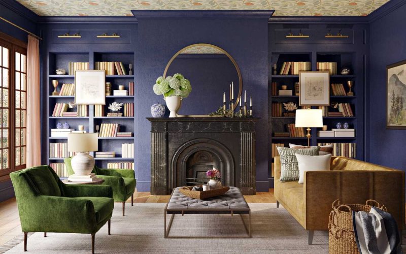 If there is a single color pairing that speaks to traditional design, it’s a classic navy and white. Go for clean white walls to modernize the look, and layer in the color duo with patterned accessories and fabrics.
