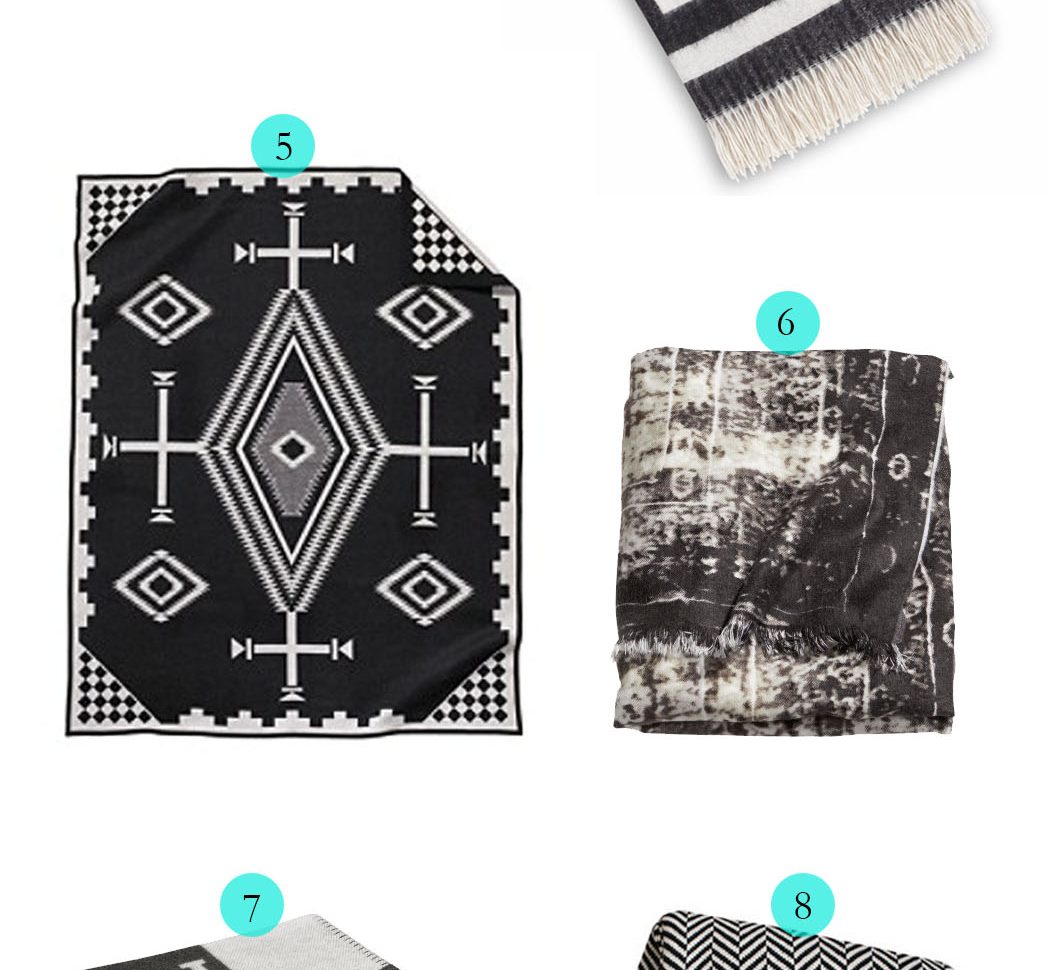 Today, it’s back to Styling 101. What’s the best way to add warmth, interest, and a graphic or colorful pop to a room? Yup– throw blankets and throw pillows. They can change the entire look/mood of your room and are relatively inexpensive and easy to interchange as you fancy. Over the back of a chair or sofa, the foot of a bed, wrapped around the sofa seat cushion (yes, it can look very cool– just ask Emily Henderson!) or “faux-upholstering” a headboard– you name it. A good versatile throw blanket is an absolute must have during these chilly winter months (who am I kidding– they are essential year round!). And not just any throw blanket….we’re particularly keen on all of the punchy/dramatic/eclectic/statement-making-yet-classic black and white varieties that seem to be so popular these days. Sound boring? Not at all….take a look: