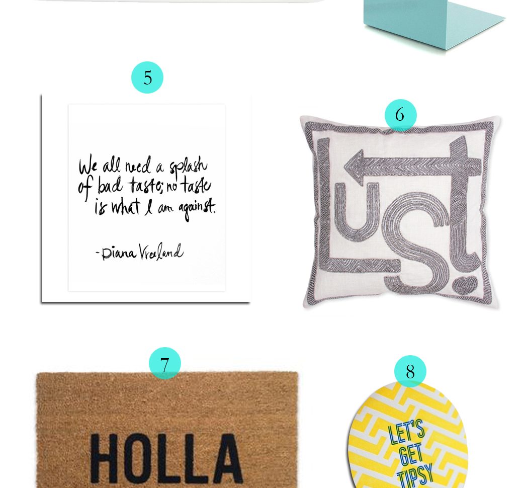 It’s easy to write off home accents with quotes/sayings/etc as too cutesy and junior. And no– your “Friends Forever” afghan and your huge “Attitude is Everything” motivation poster are NOT going to cut it anymore (/ did they ever?). There is a whole wide world of statement-making, envy-inducing typographic decorating elements out there for you to get your hands on. Beyond adding a bit of character to your space, a bold/graphic/cheeky doormat, print or throw pillow will make you smile every time it catches your eye. Insta-mood lifter? Sold!
