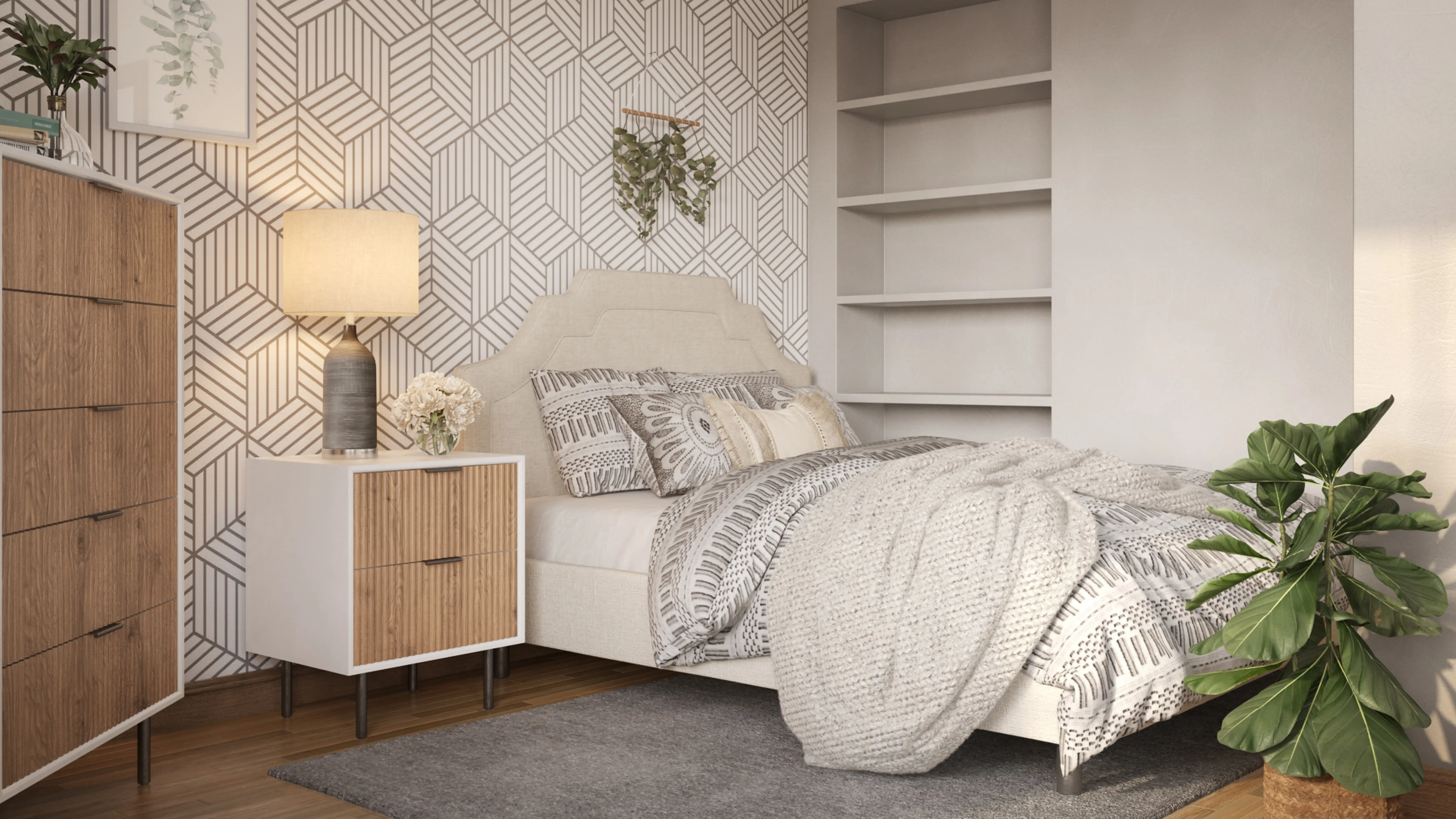 For this Bedroom, Austin selected wall shelves, ledges, beds, and bed frames from Uttermost and Skyline Furniture. Discover Furniture design inspiration on Havenly.