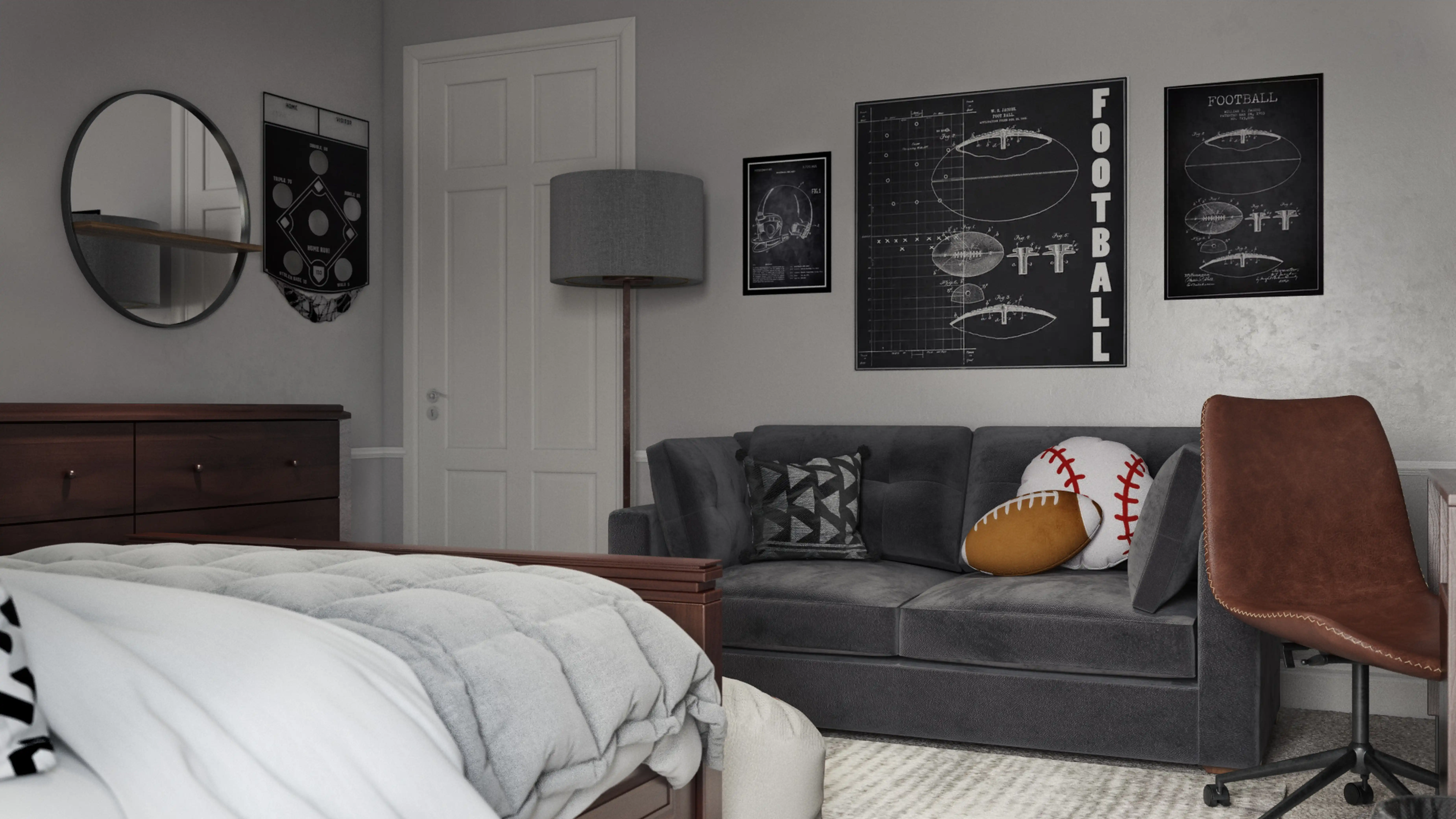 For this Bedroom, Samantha selected bookcases, standing shelves, and sofas from Pottery Barn Teen and Wayfair. Discover Furniture design inspiration on Havenly.