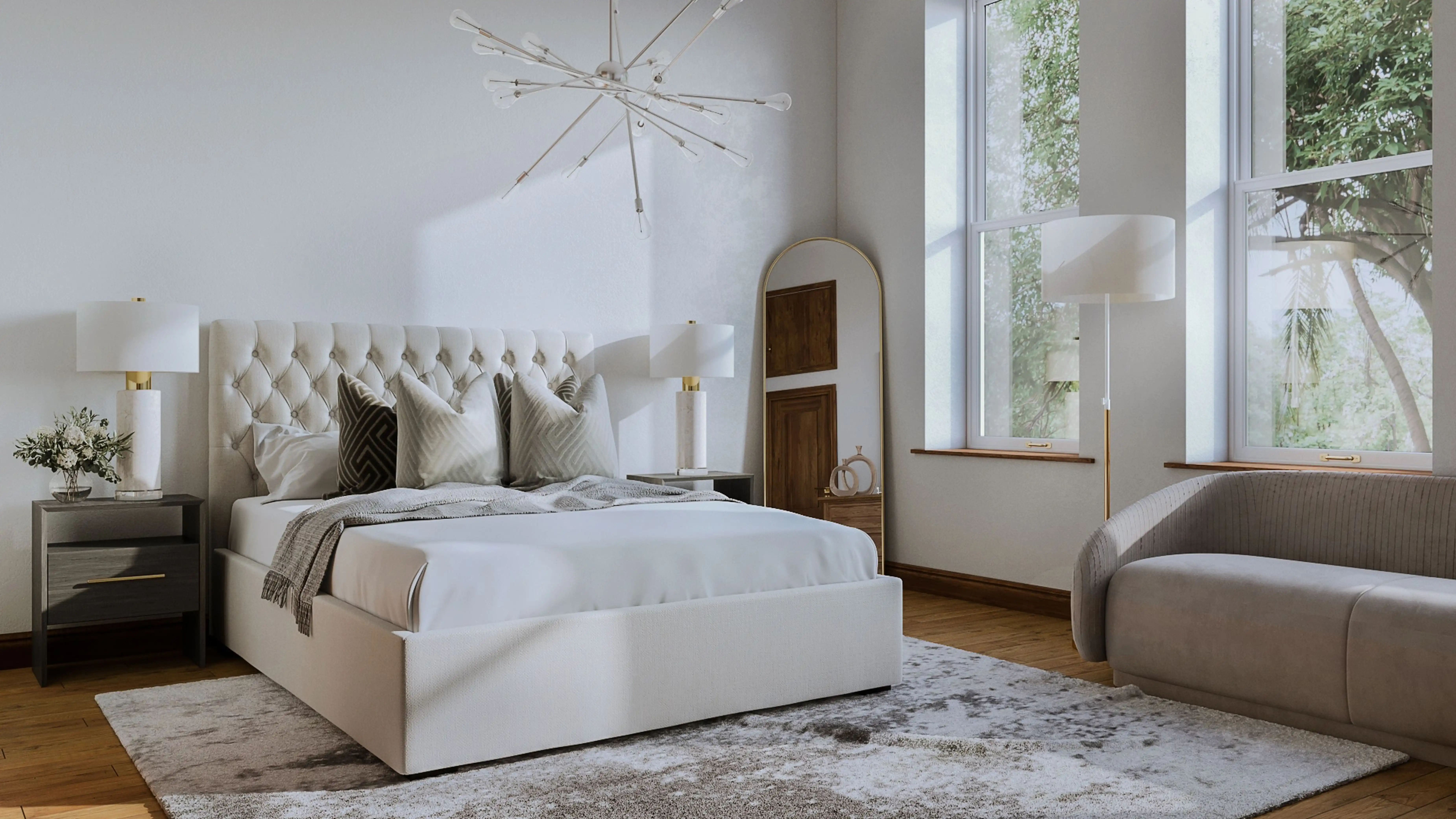 For this Bedroom, Anna selected sofas and dressers from Kathy Kuo Home and Safavieh. Discover Furniture design inspiration on Havenly.