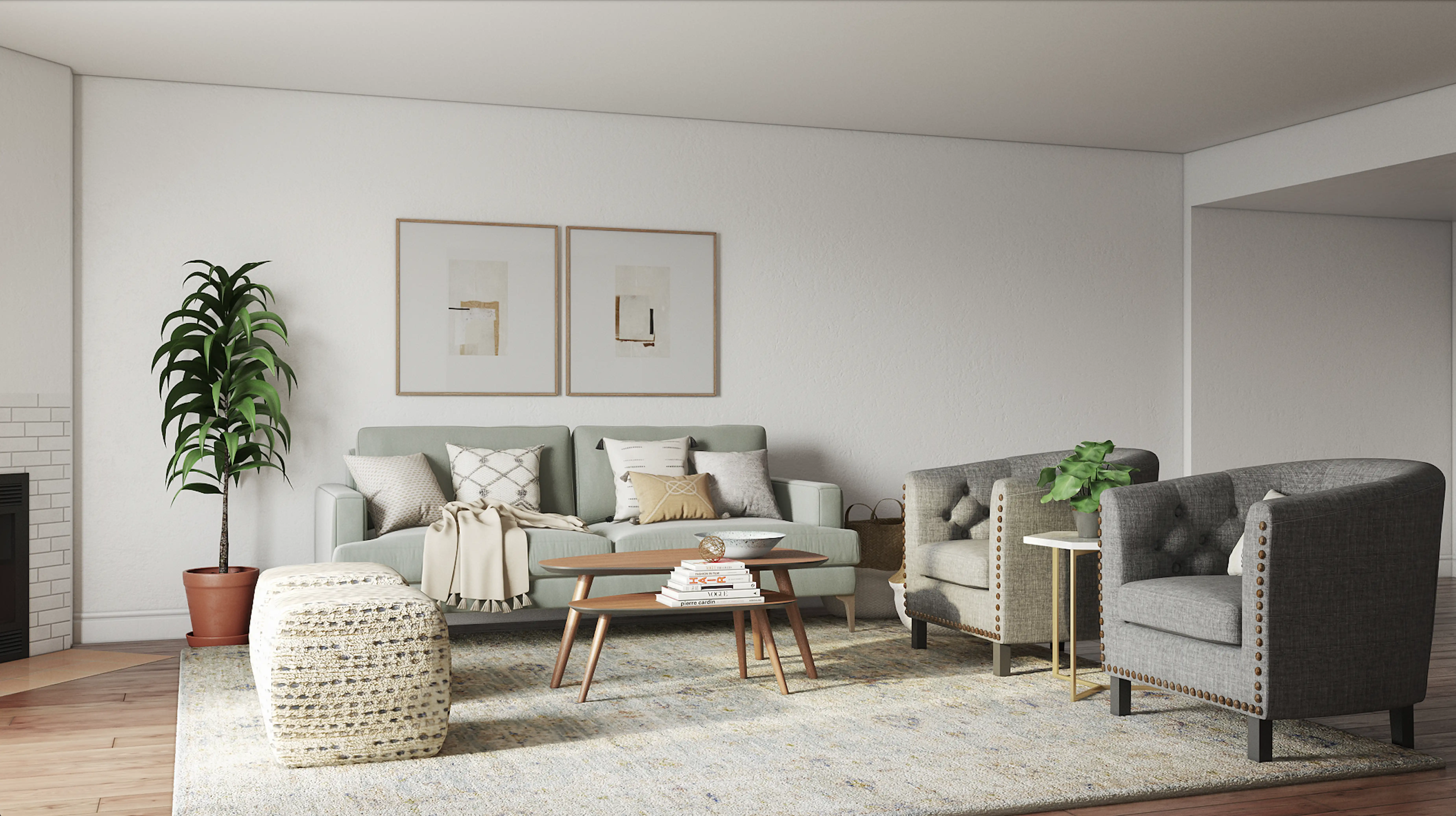 For this Living Room, Jennifer selected end tables and ottomans from West Elm and Wayfair. Discover Furniture design inspiration on Havenly.