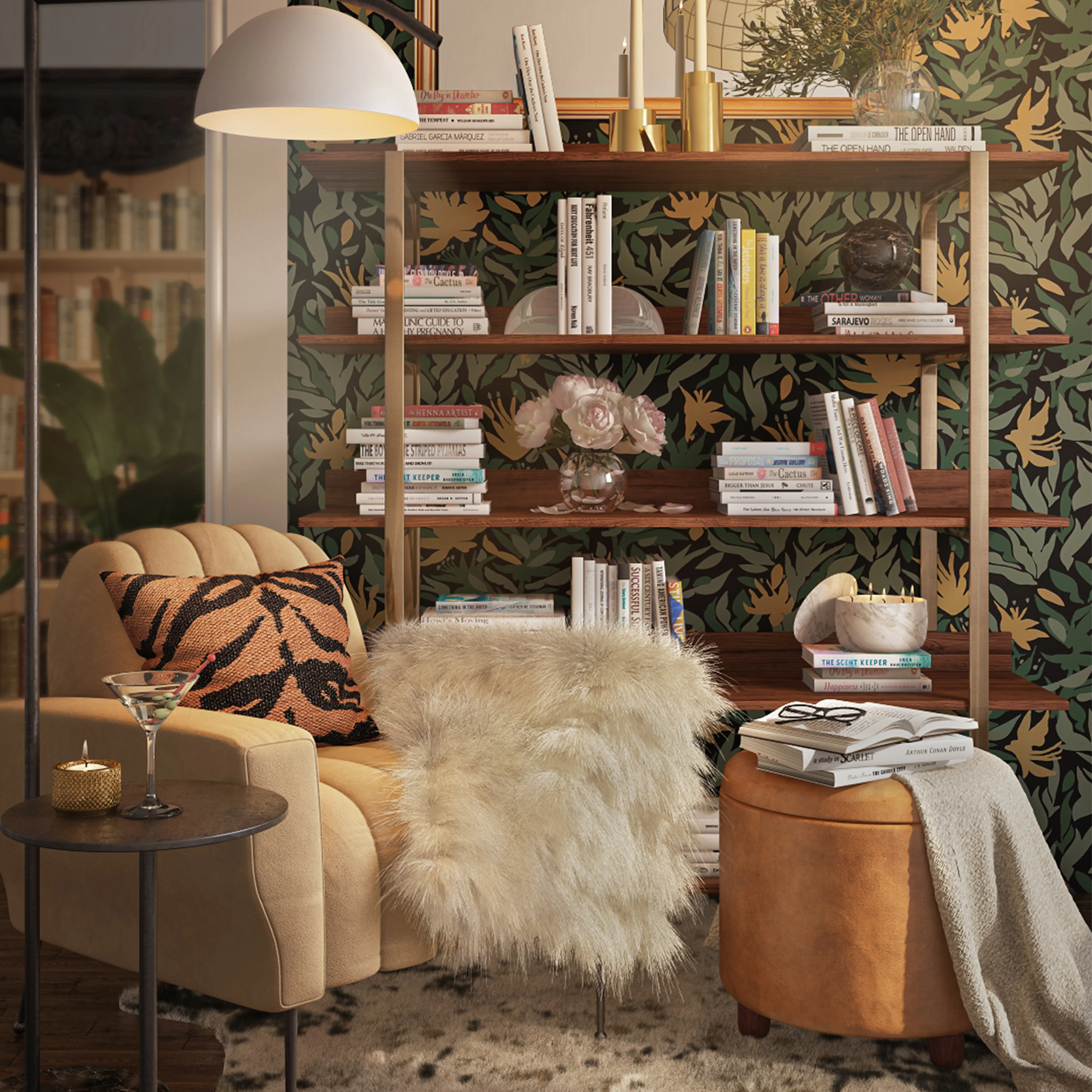 For this room, Melissa selected bookcases, standing shelves, and ottomans from Wayfair and Uttermost. Discover Furniture design inspiration on Havenly.