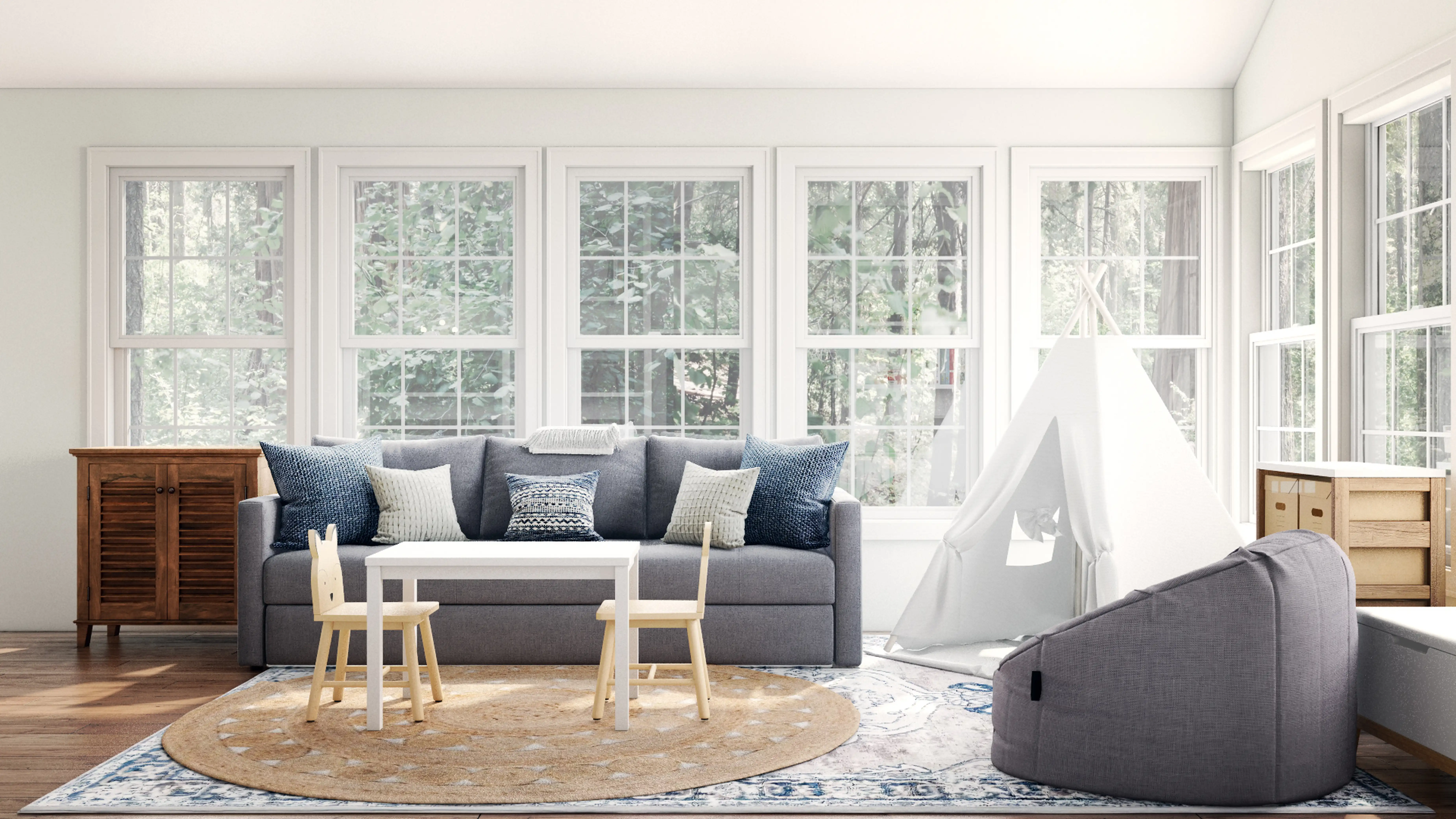 For this room, Sarah selected poufs, kitchen, and dining room chairs from Wayfair, Crate, and Kids. Discover Furniture design inspiration on Havenly.