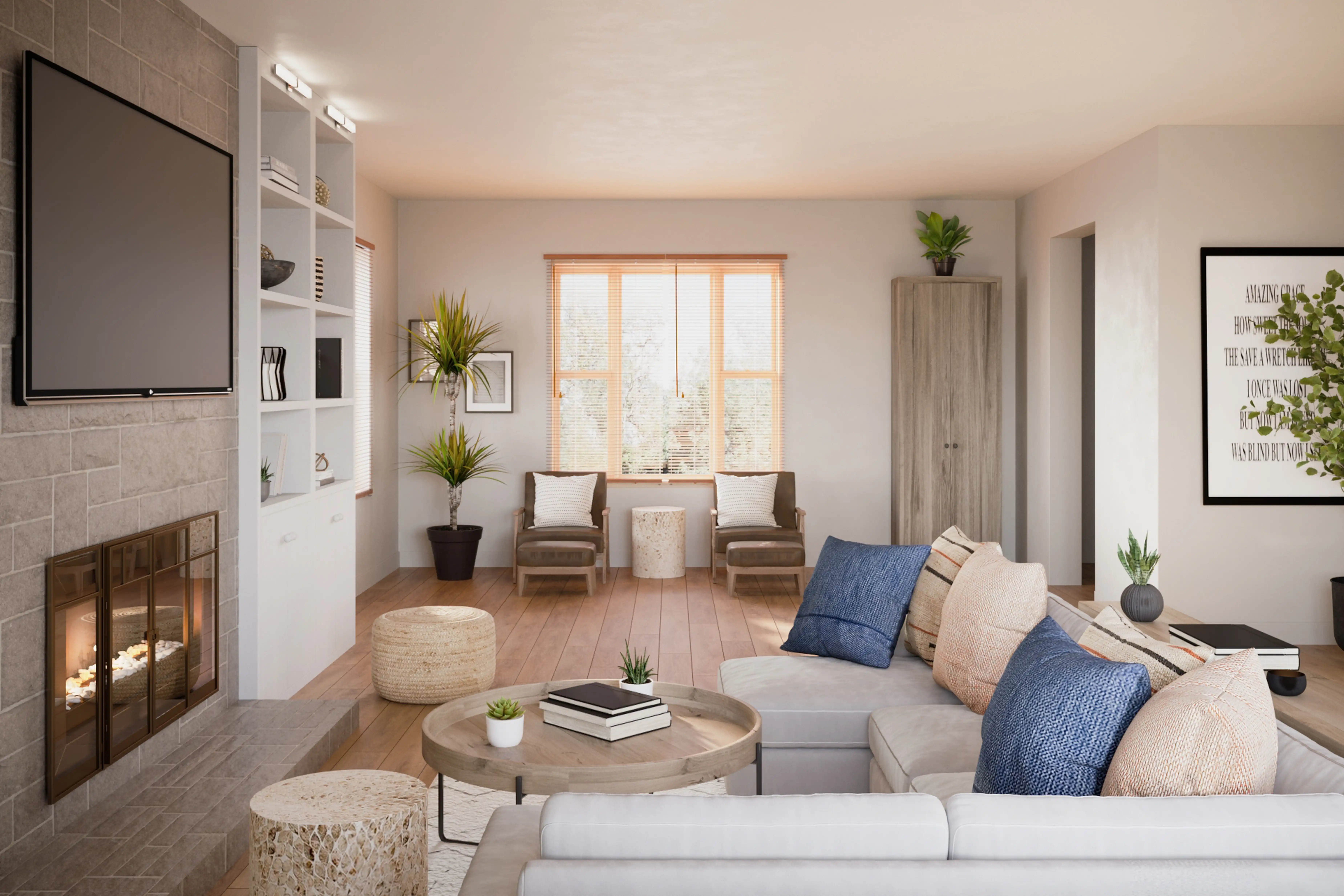 For this Living Room, Sam selected coffee tables and ottomans from West Elm and Wayfair. Discover Furniture design inspiration on Havenly.