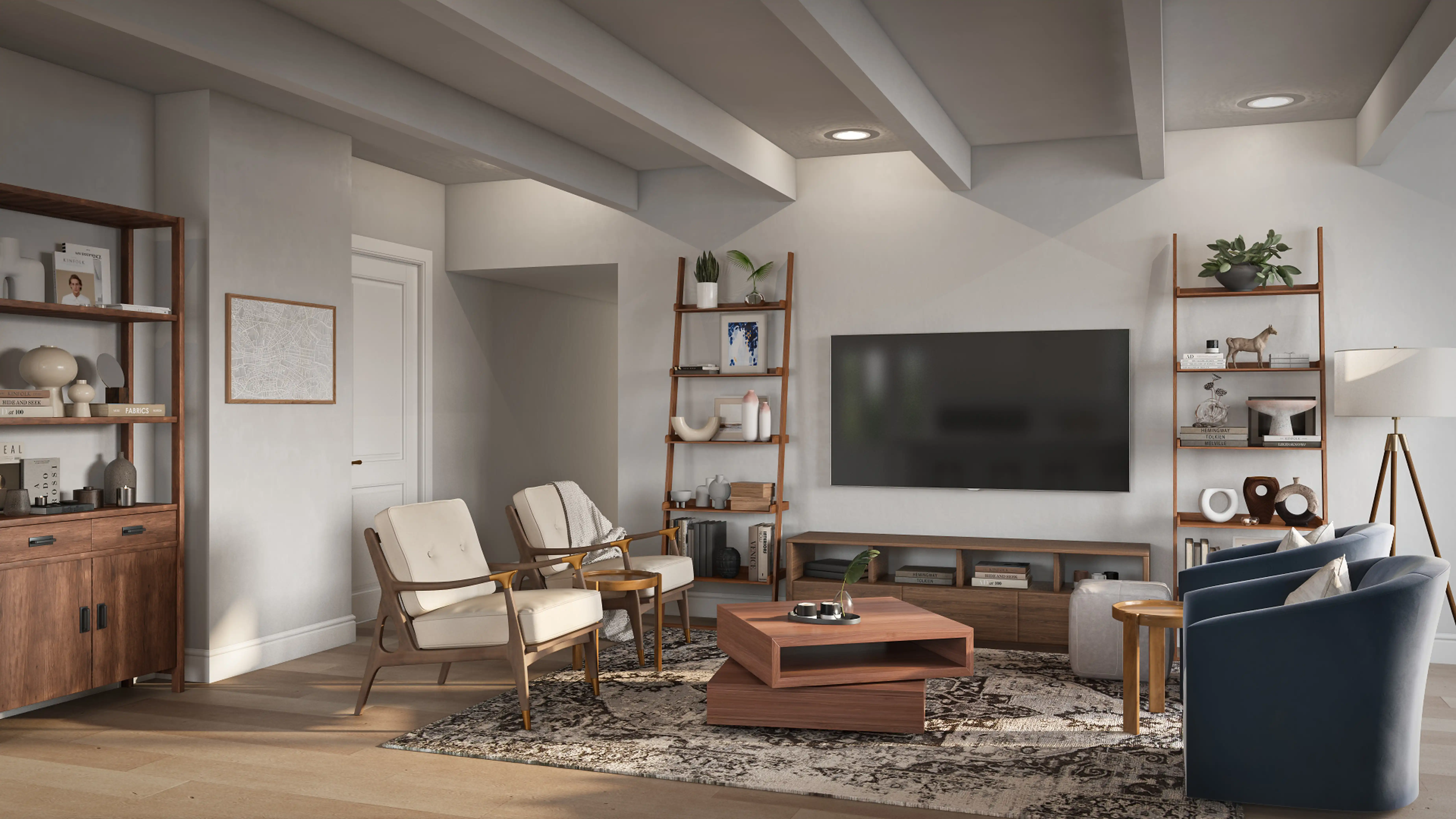 For this room, Catrina selected bookcases, standing shelves, and coffee tables from Wayfair and CB2. Discover Furniture design inspiration on Havenly.
