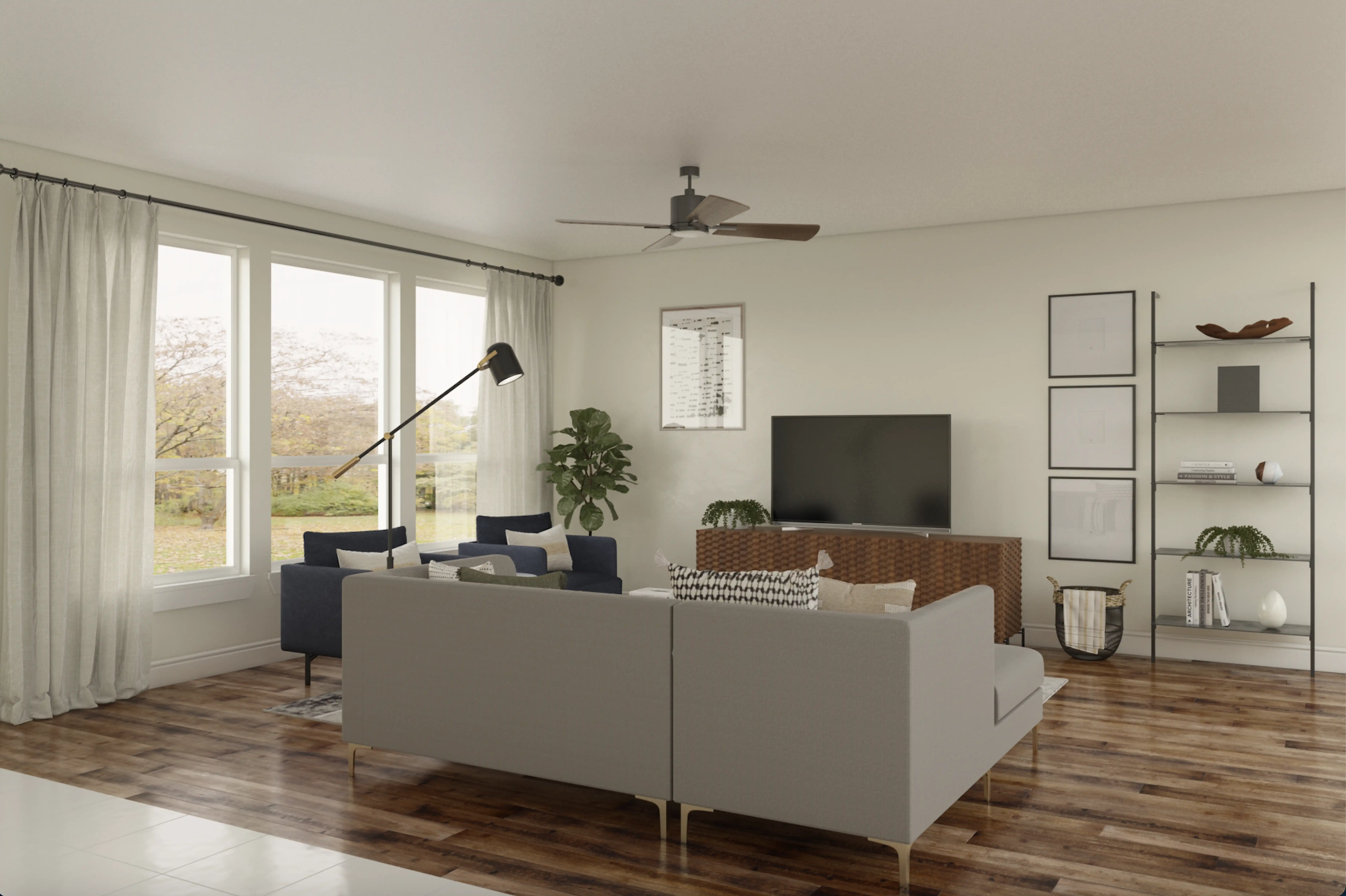 To brighten the design, Midcentury Modern ceiling light fixtures and lamps were added to the room. Discover Lighting design inspiration on Havenly.