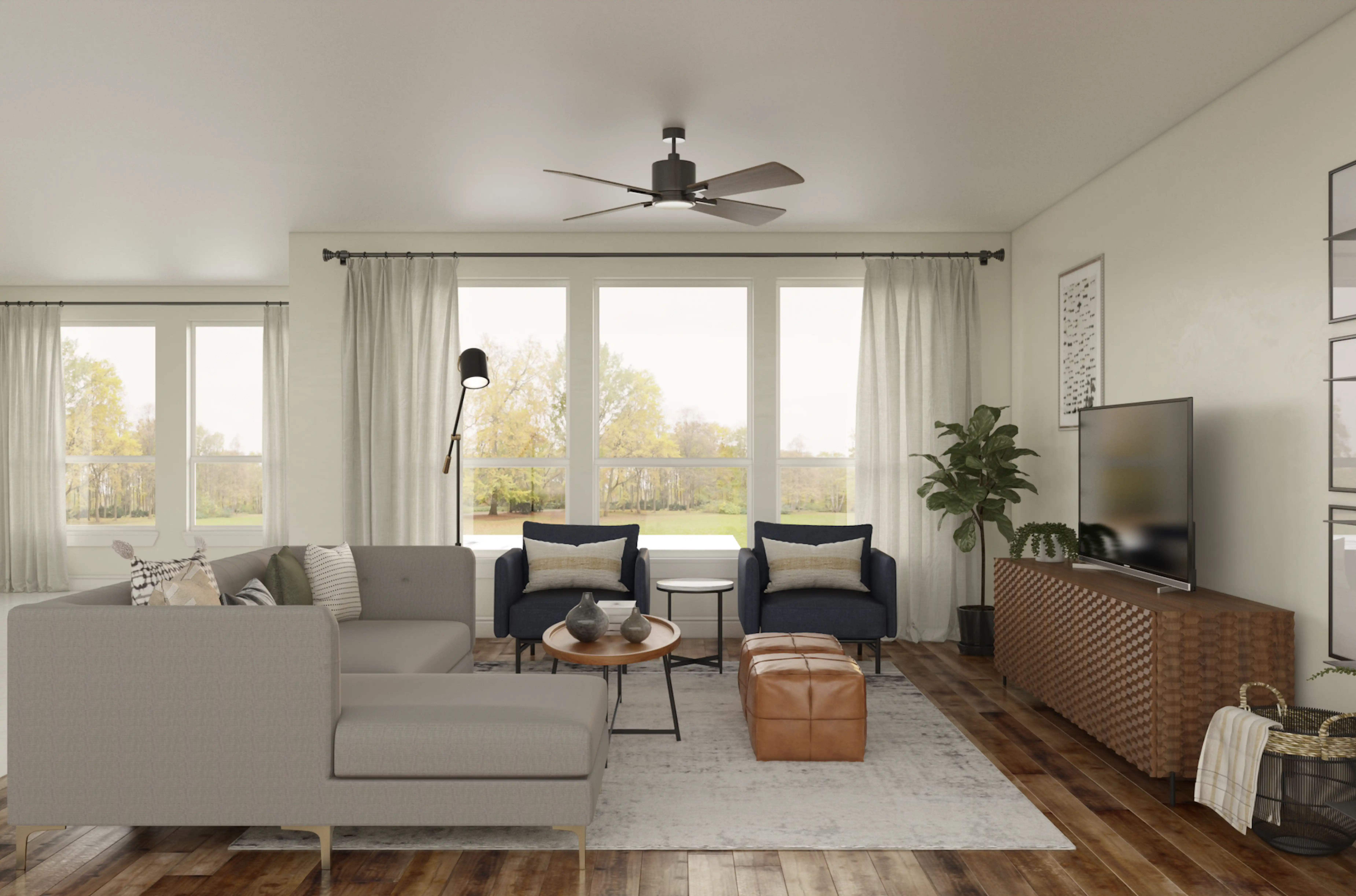 For this room, Jennifer selected poufs, media storage cabinets, and racks from CB2, Crate, and Barrel. Discover Furniture design inspiration on Havenly.