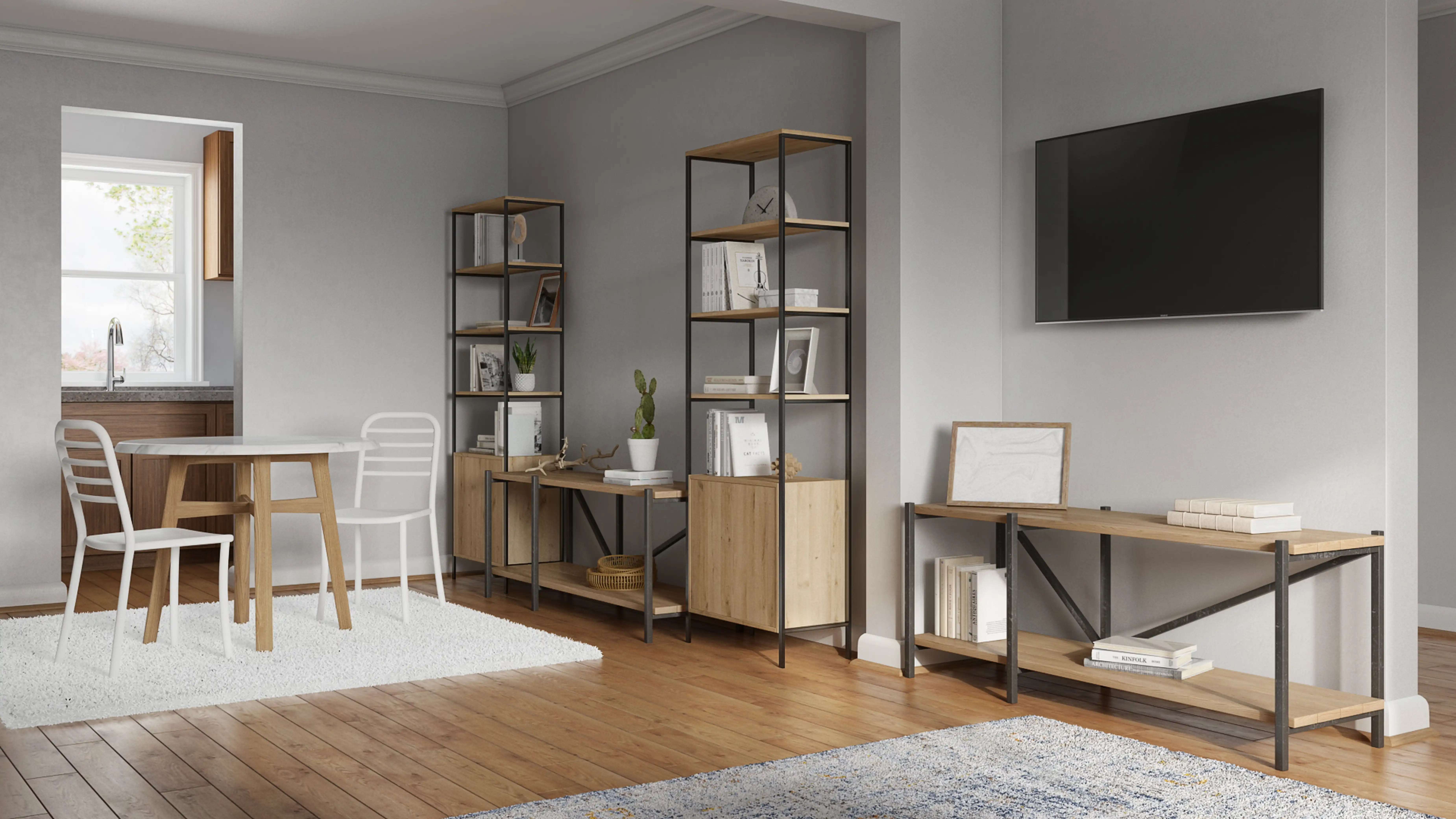 For this Living Room, Sarah selected outdoor chairs, media storage cabinets, and racks from Zuri Studios and Safavieh. Discover Furniture design inspiration on Havenly.