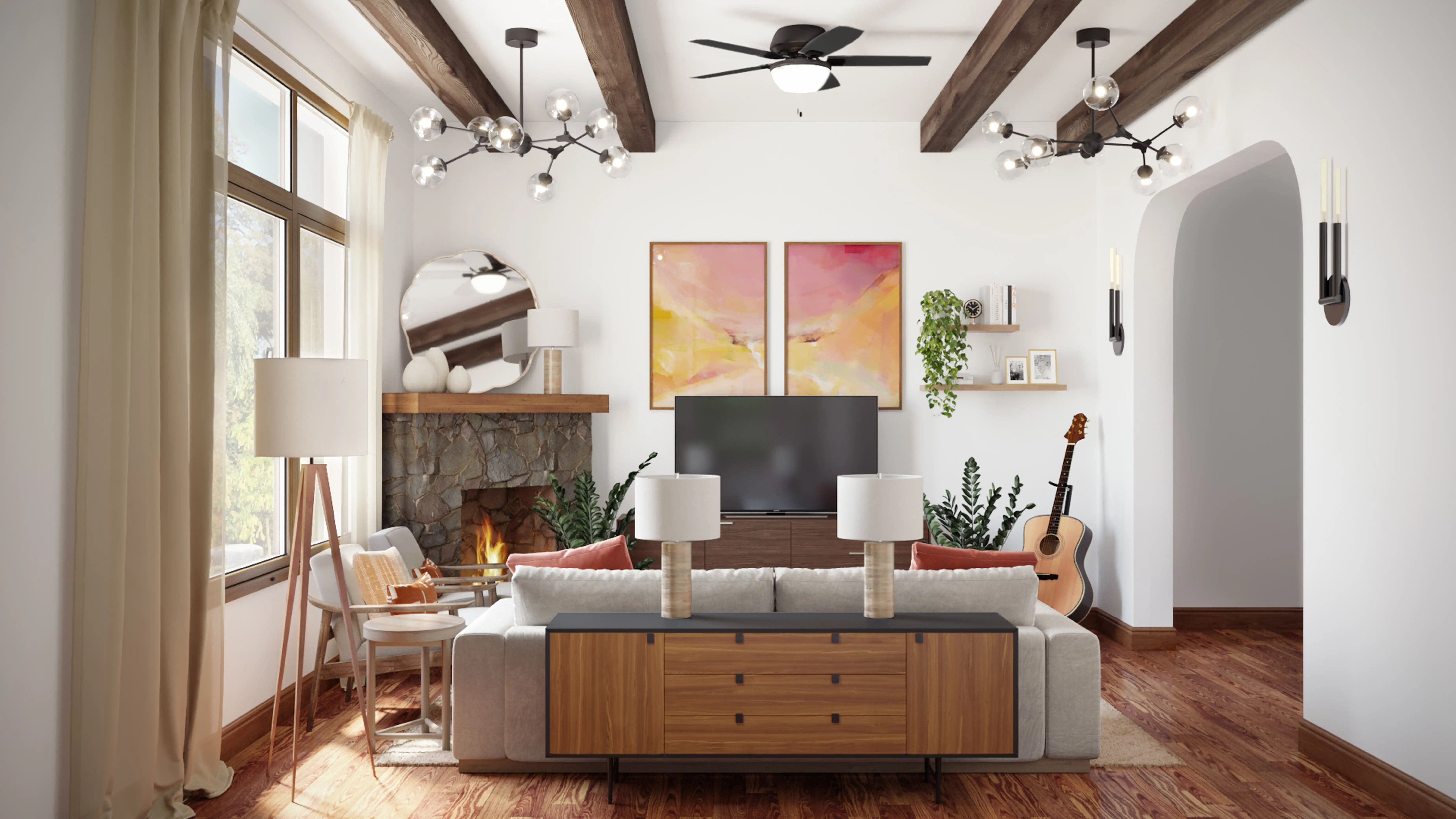 To brighten the design, Eclectic lamps and ceiling light fixtures were added to the room. Discover Lighting design inspiration on Havenly.