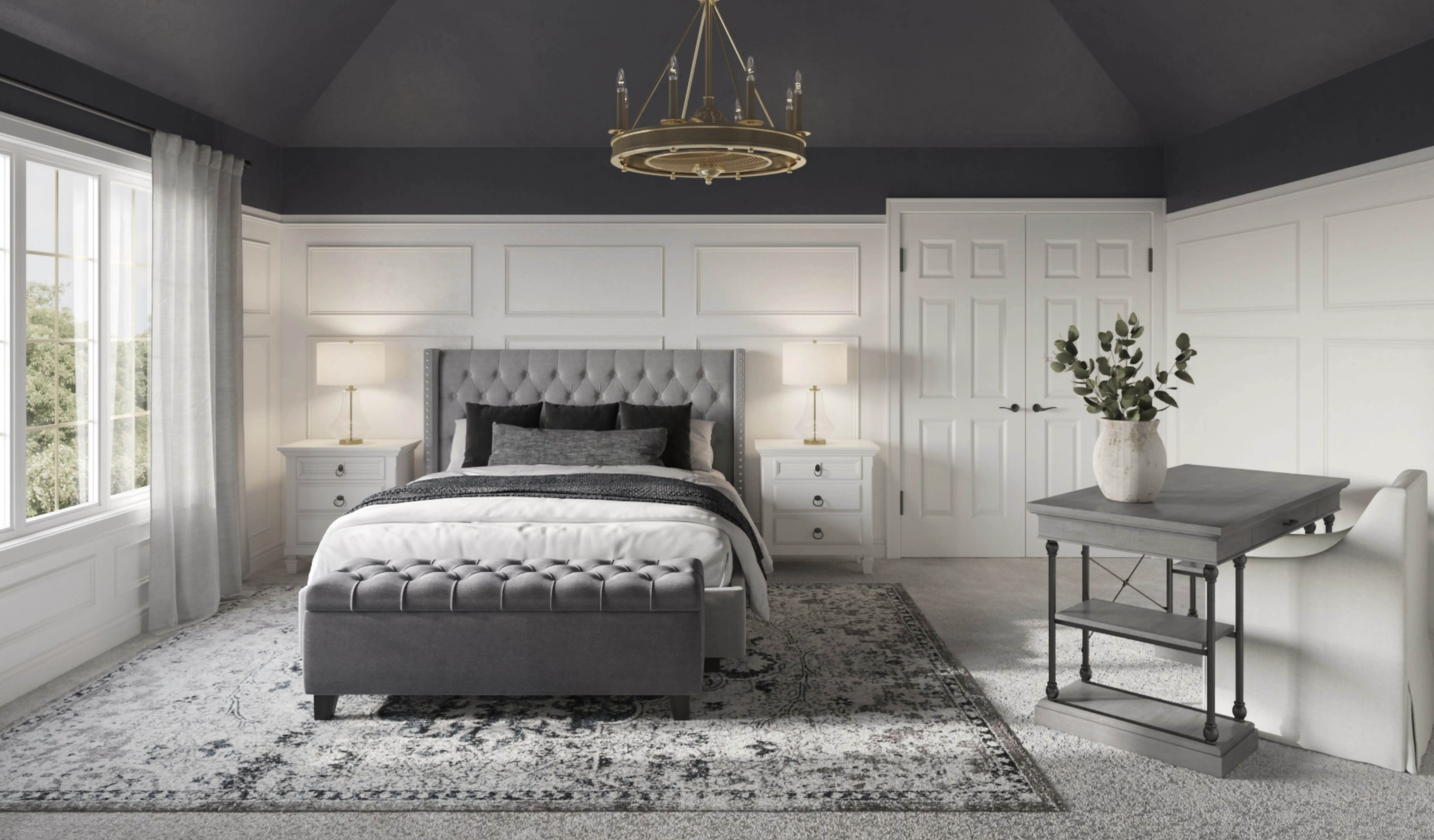 For this Bedroom, Stacy selected desks, kitchen, and dining room chairs from Wayfair and Pottery Barn. Discover Furniture design inspiration on Havenly.
