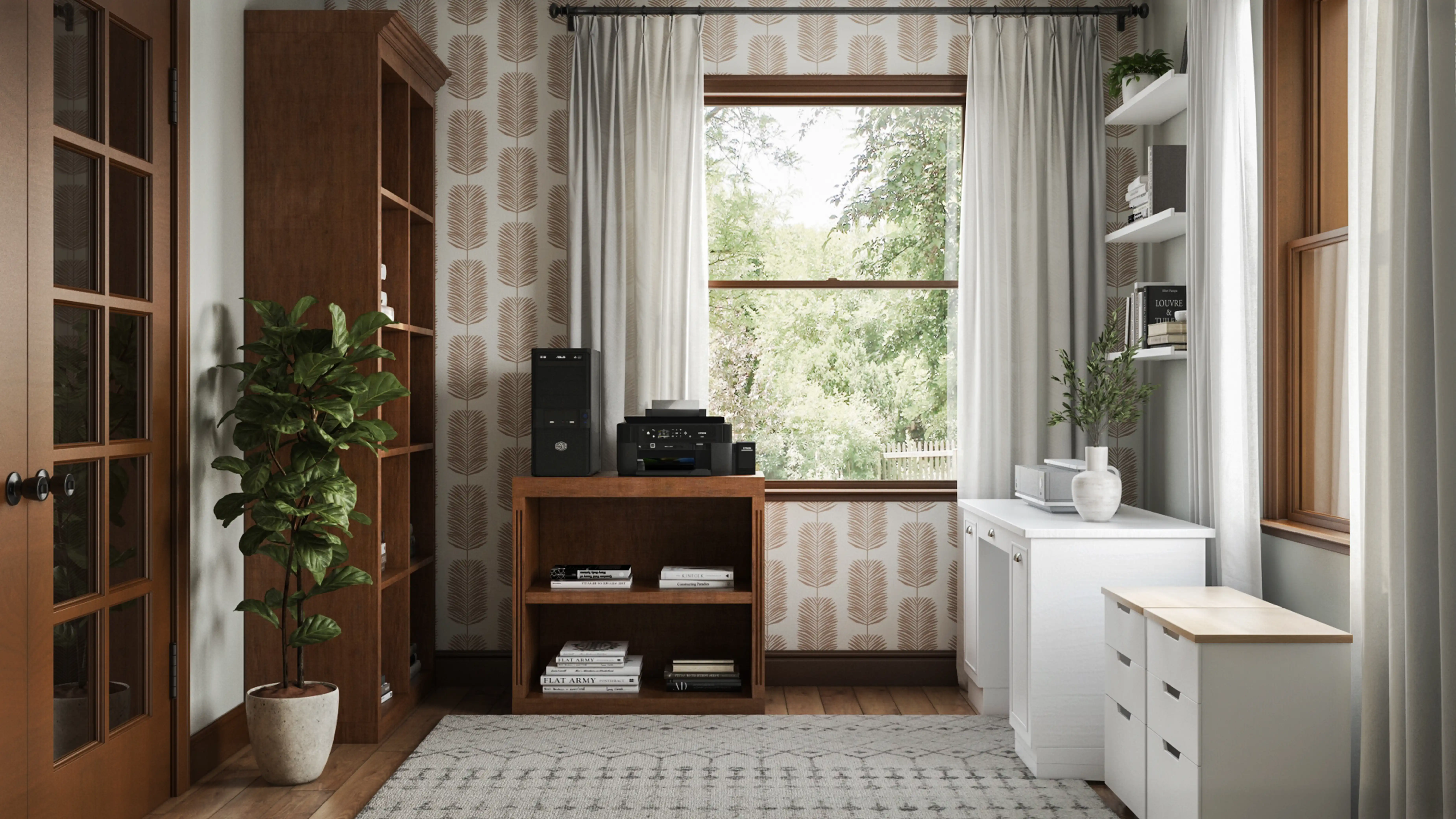 For this room, Ingrid selected bookcases, standing shelves, and desks from AllModern and Wayfair. Discover Furniture design inspiration on Havenly.