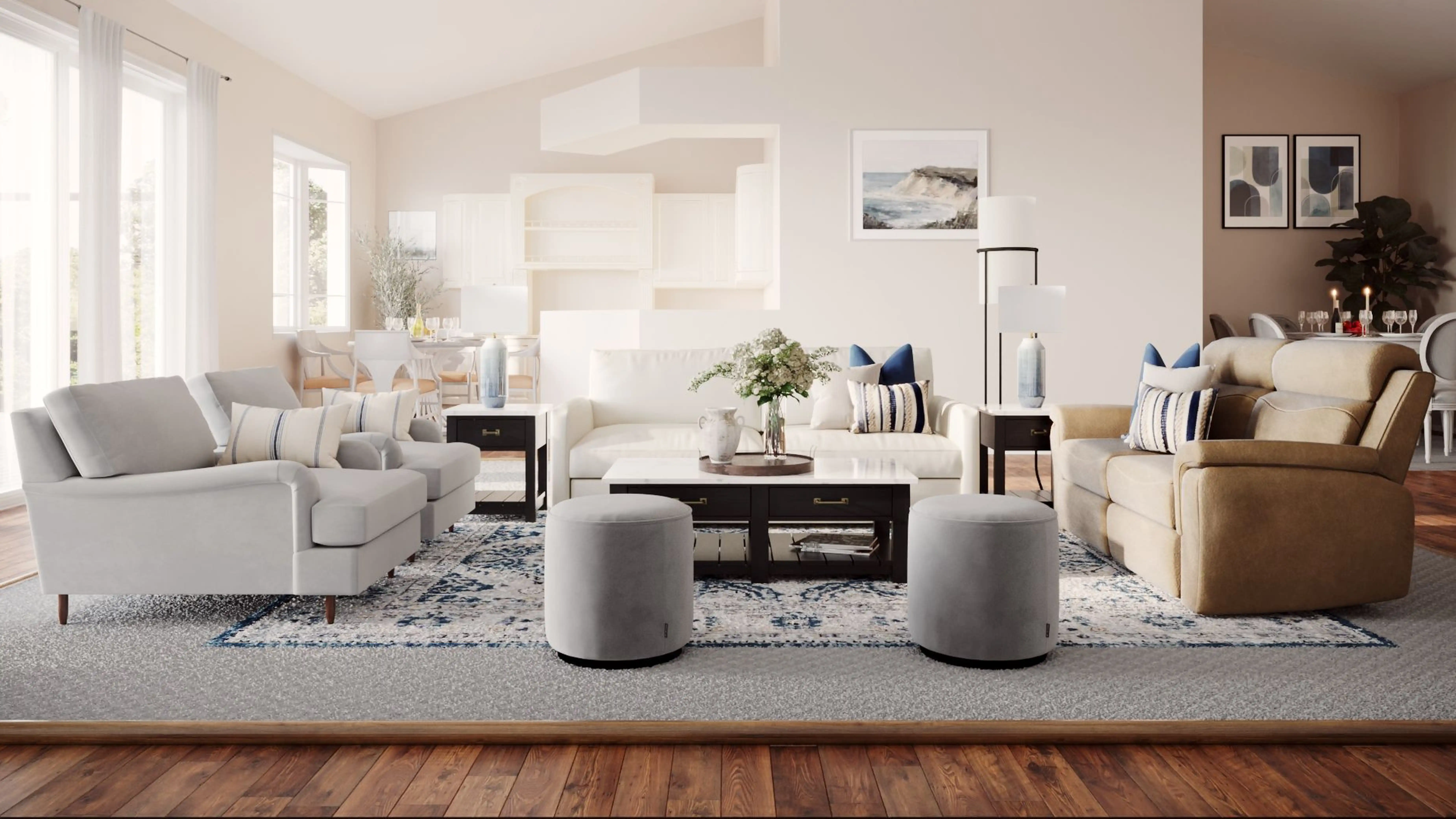 For this Living Room, Mariel selected ottomans and sofas from Crate, Barrel, and West Elm. Discover Furniture design inspiration on Havenly.