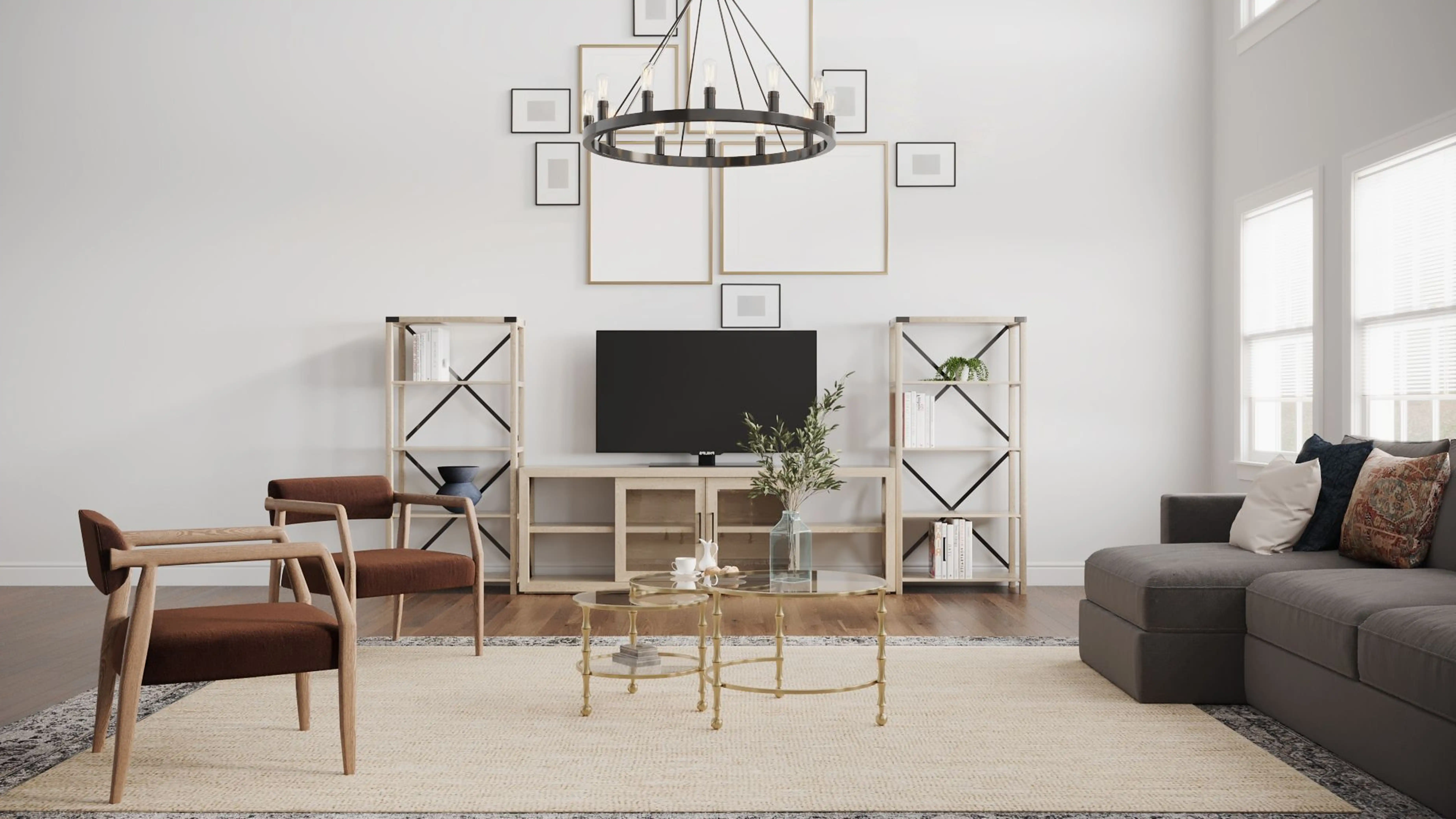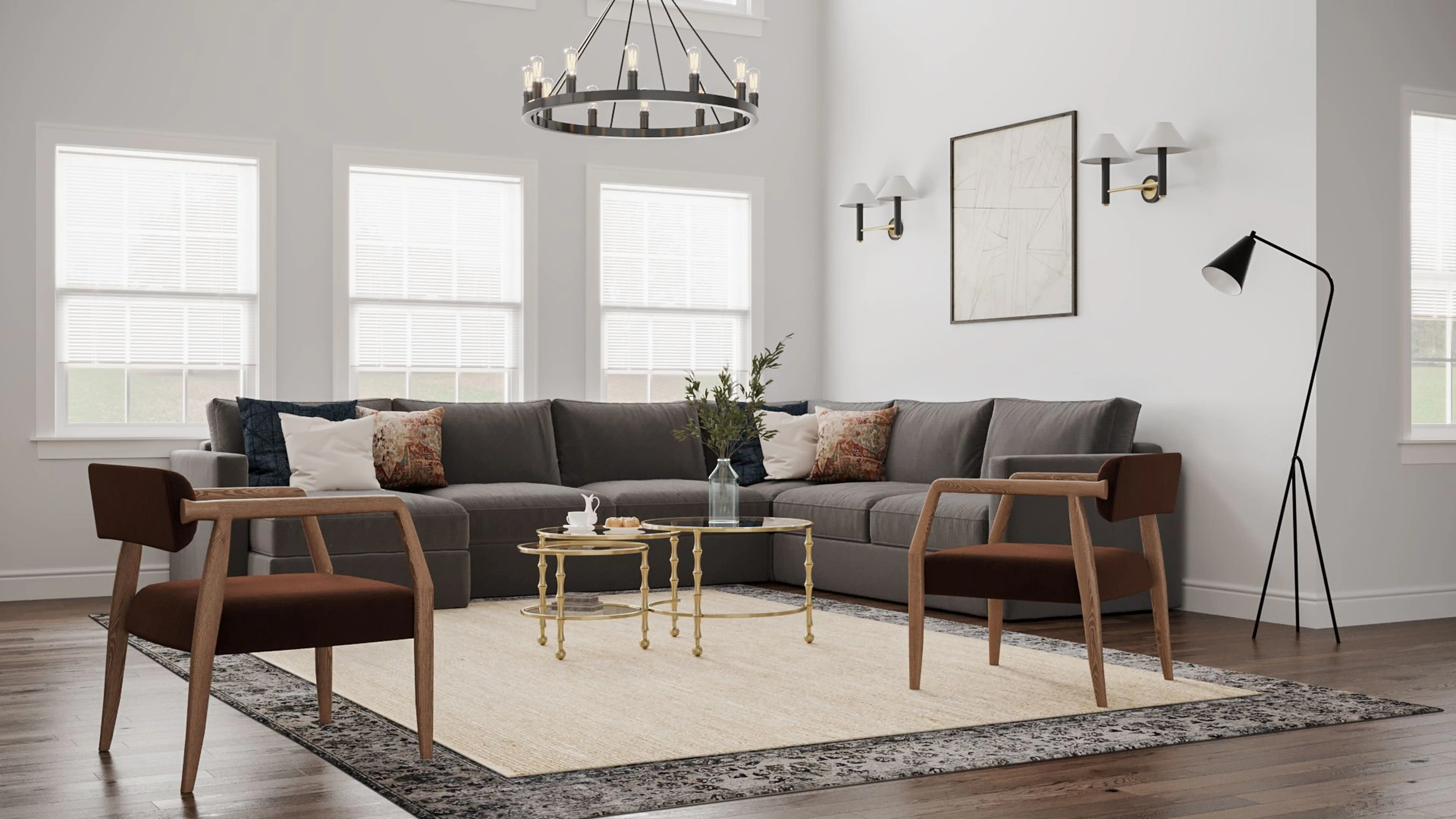 To brighten the design, Eclectic chandeliers and lamps were added to the room. Discover Lighting design inspiration on Havenly.