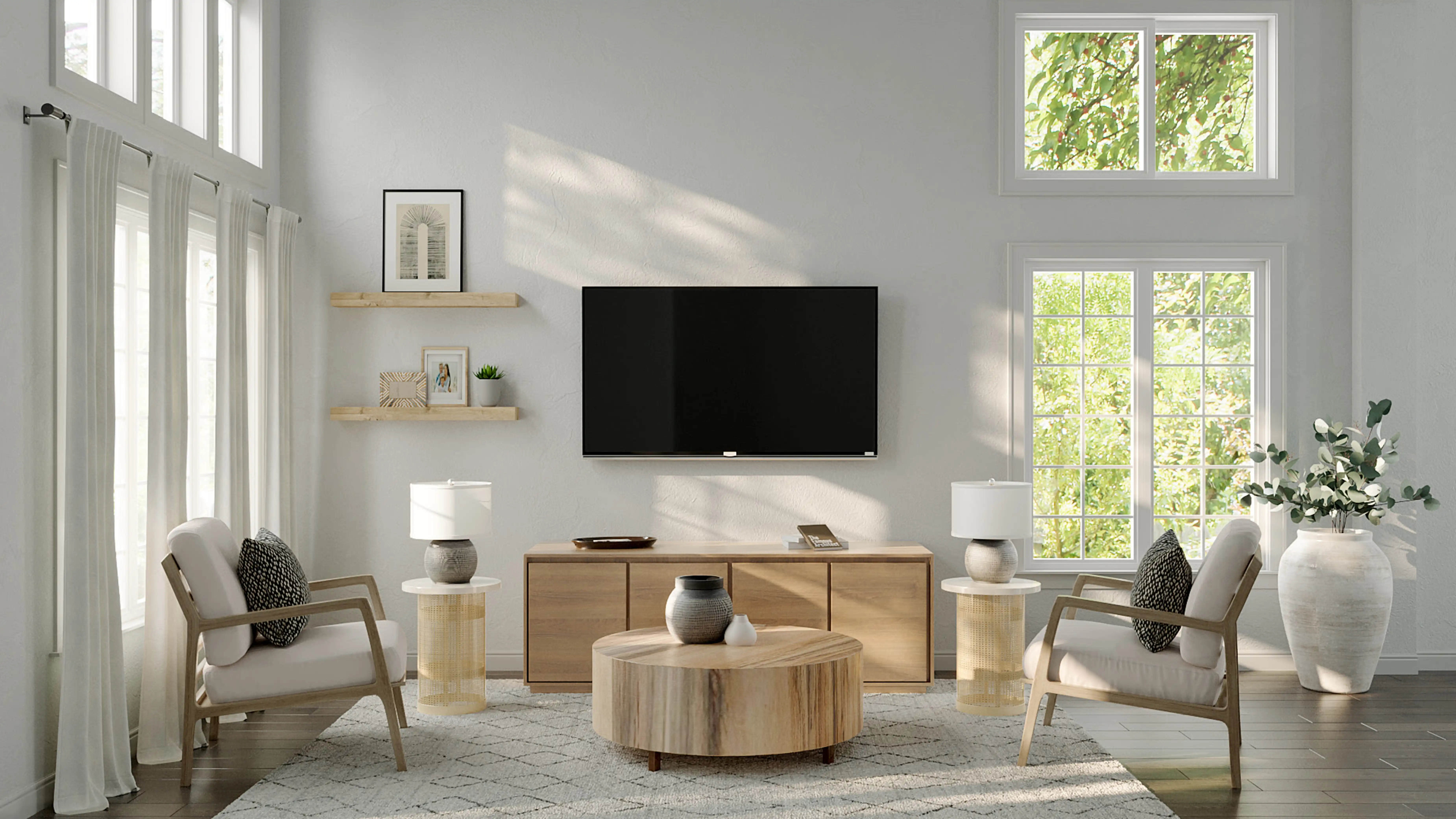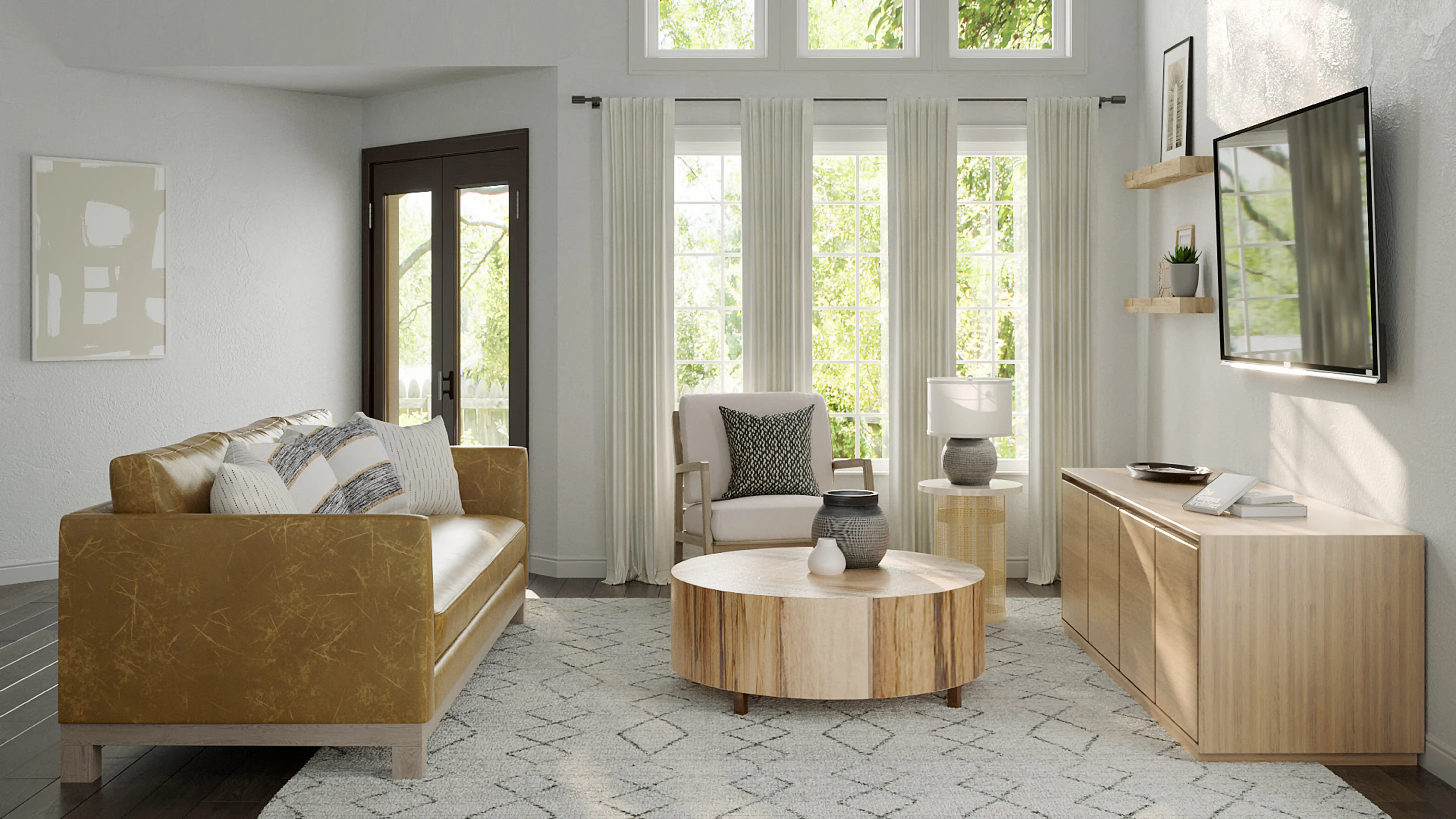 For this Living Room, Melissa selected coffee tables, wall shelves, and ledges from Crate, Barrel, and Pottery Barn. Discover Furniture design inspiration on Havenly.