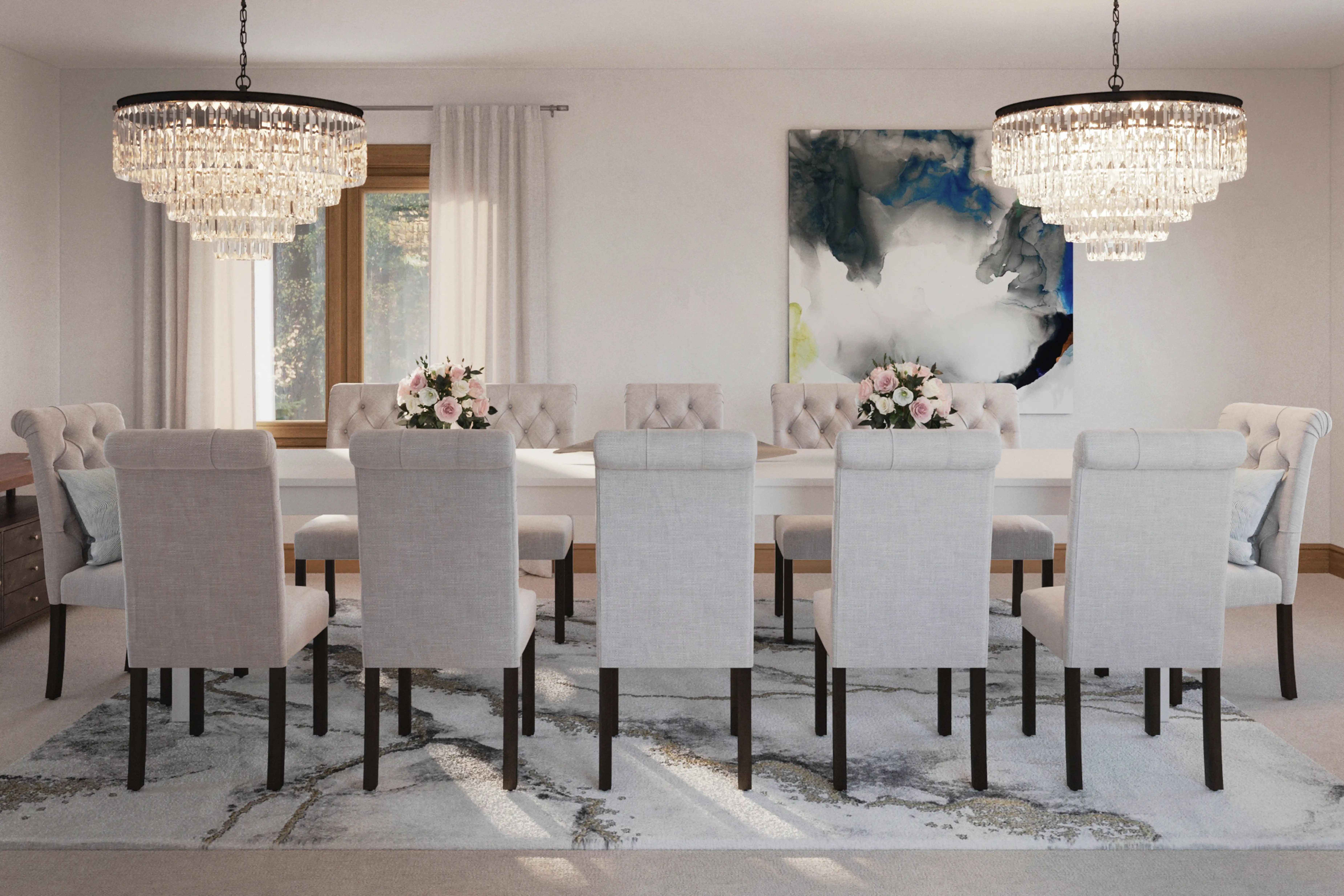 To brighten the design, Modern chandeliers were added to the room. Discover Lighting design inspiration on Havenly.