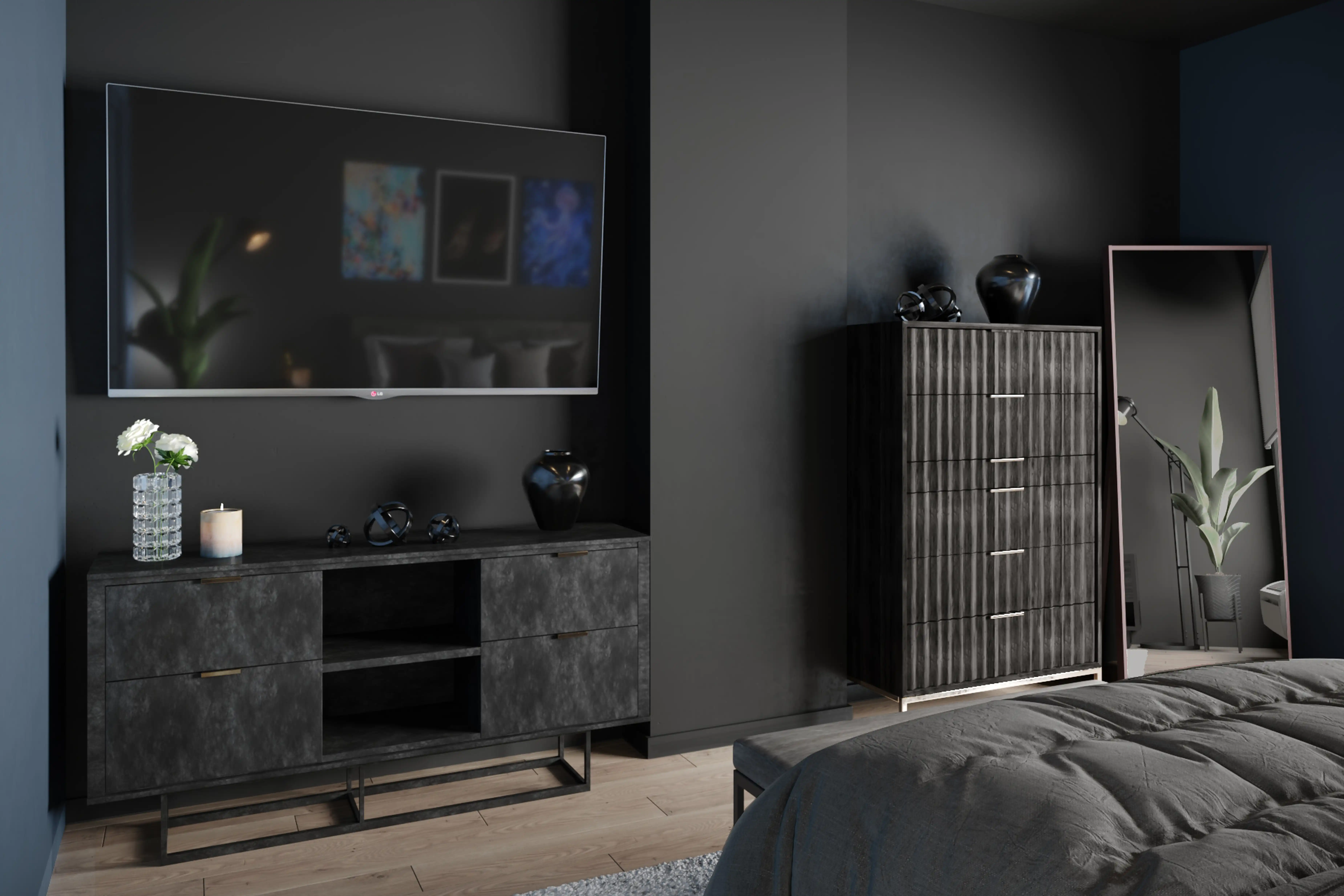 For this Bedroom, Miguel selected media storage cabinets, racks, and end tables from Perigold and AllModern. Discover Furniture design inspiration on Havenly.