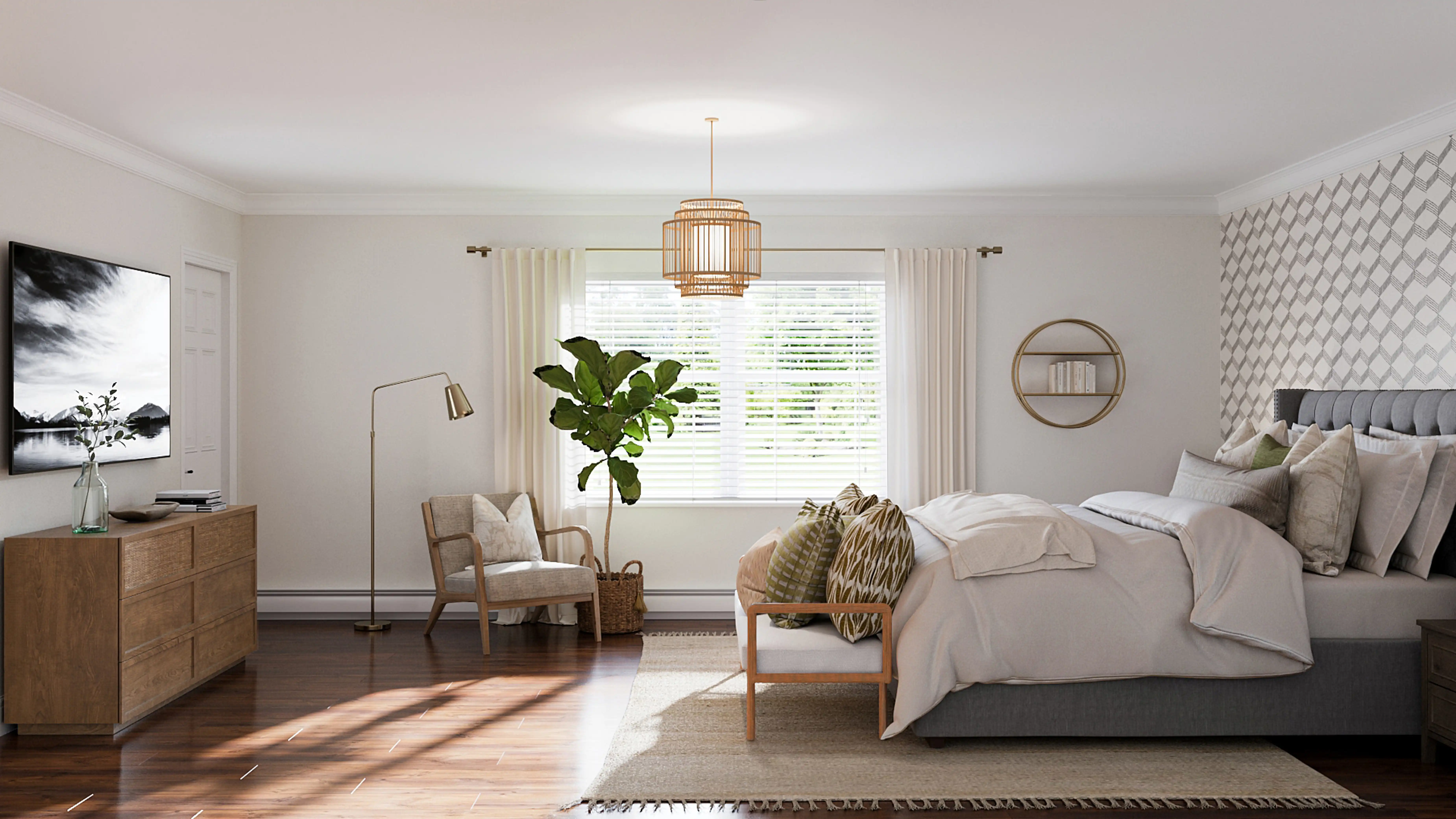 To brighten the design, Transitional ceiling light fixtures, light ropes, and strings were added to the room. Discover Lighting design inspiration on Havenly.