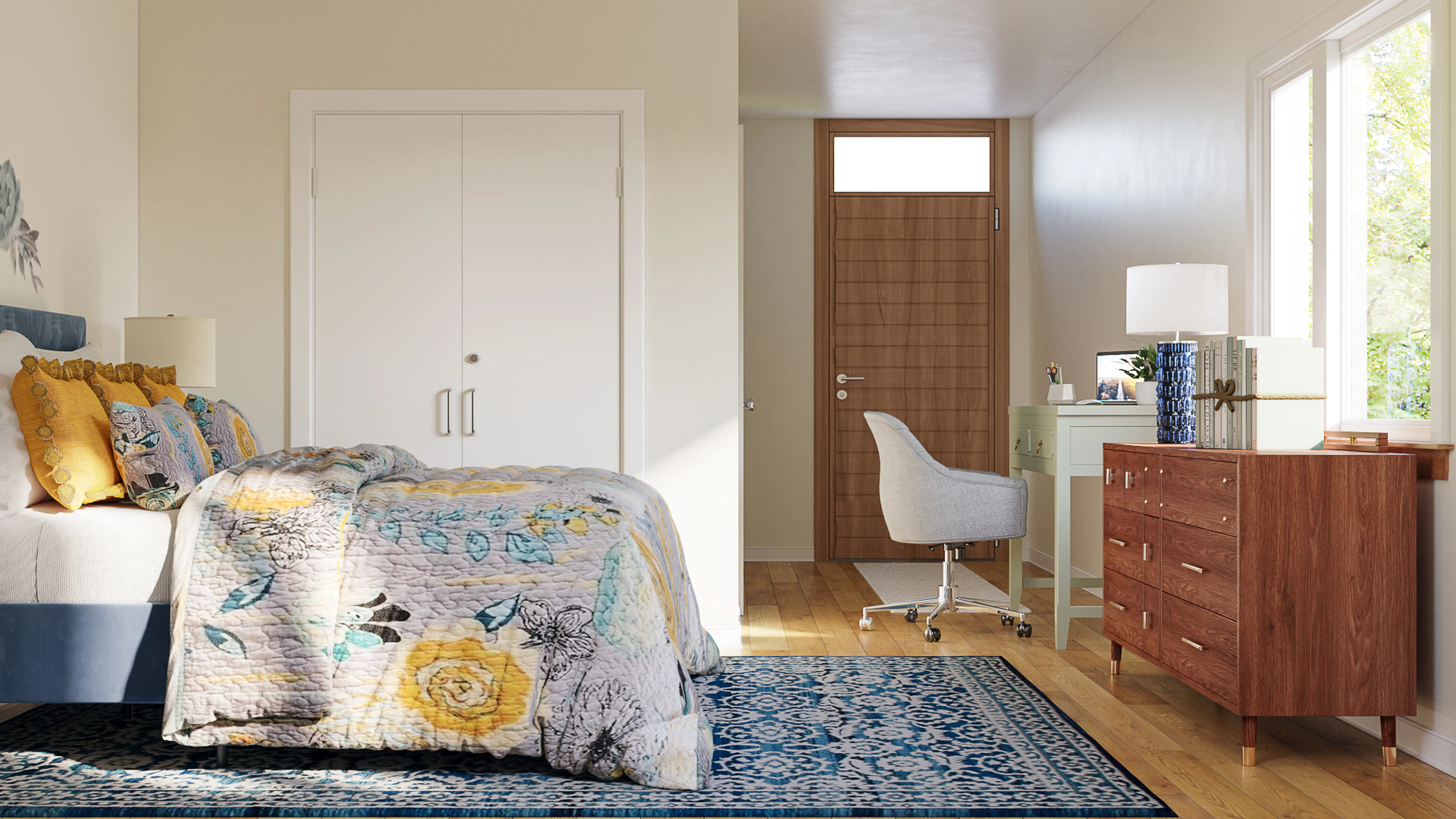 No room is complete without throw pillows and bedskirts! Mixing up 100% cotton and fabric with mustard and blue helps to add the finishing touches to the room. Discover Decor & Pillow design inspiration on Havenly.