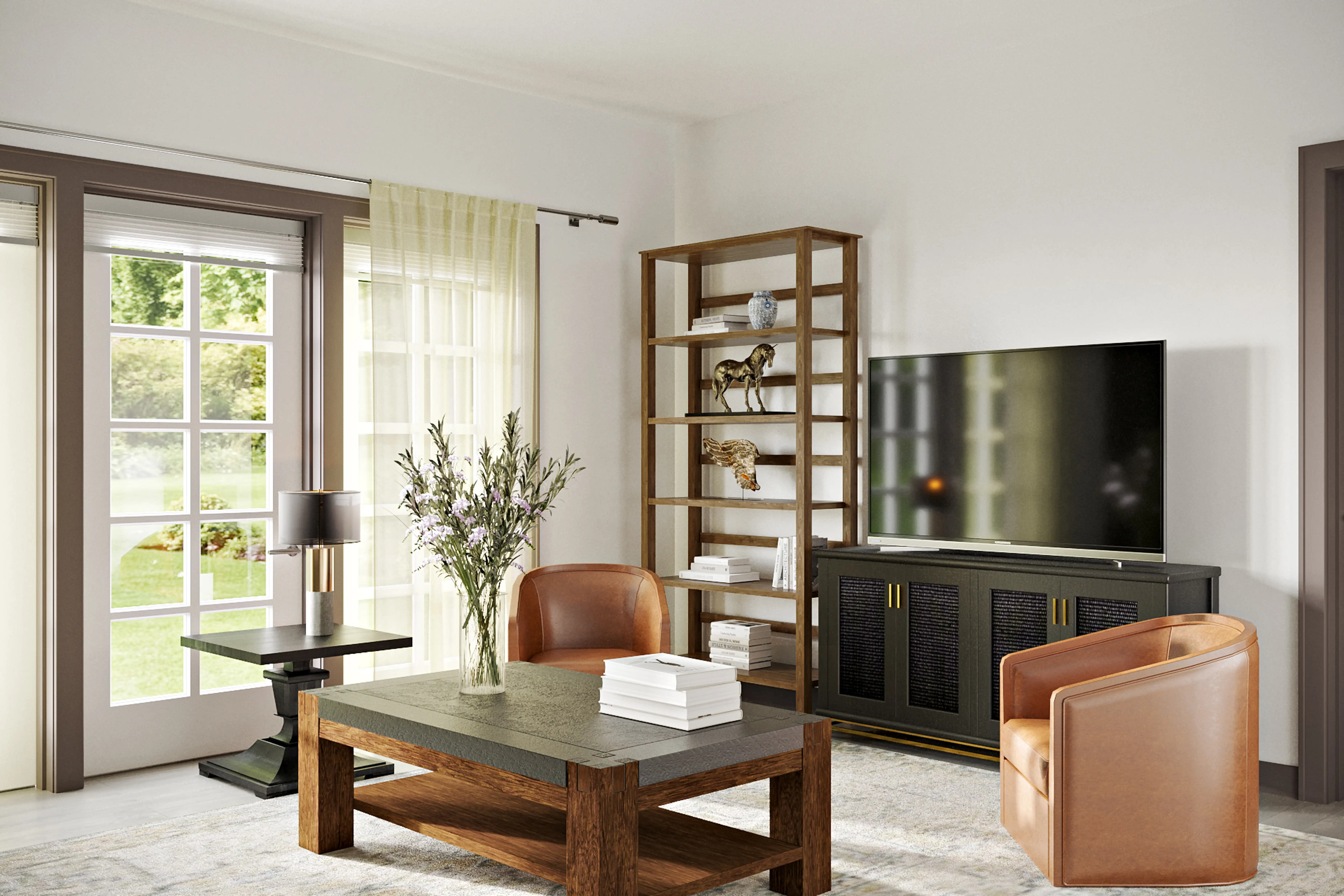 For this Living Room, Mariel selected coffee tables, bookcases, and standing shelves from West Elm and Wayfair. Discover Furniture design inspiration on Havenly.