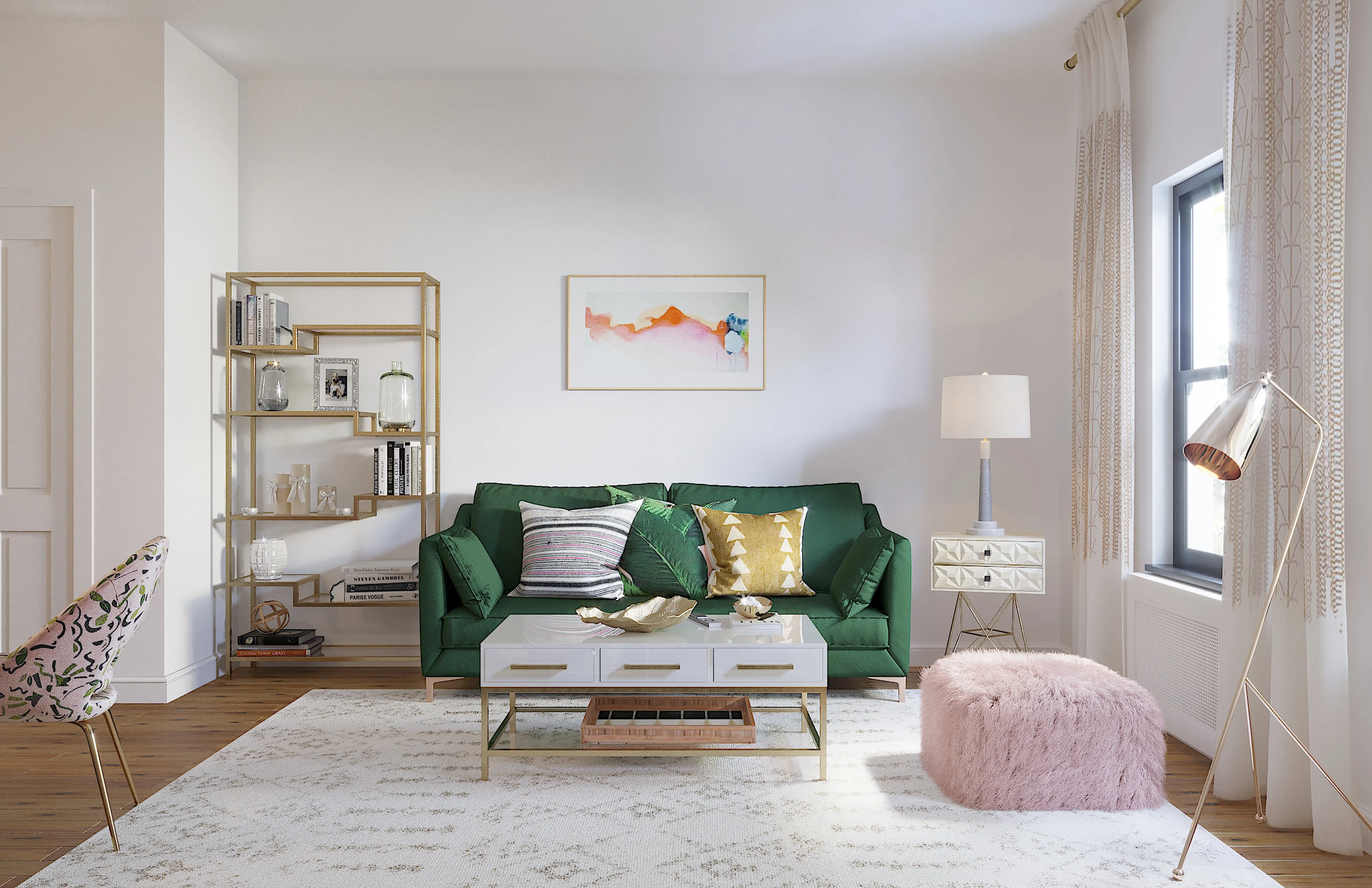 For this room, Robyn selected bookcases, standing shelves, and poufs from Home Depot and Surya. Discover Furniture design inspiration on Havenly.