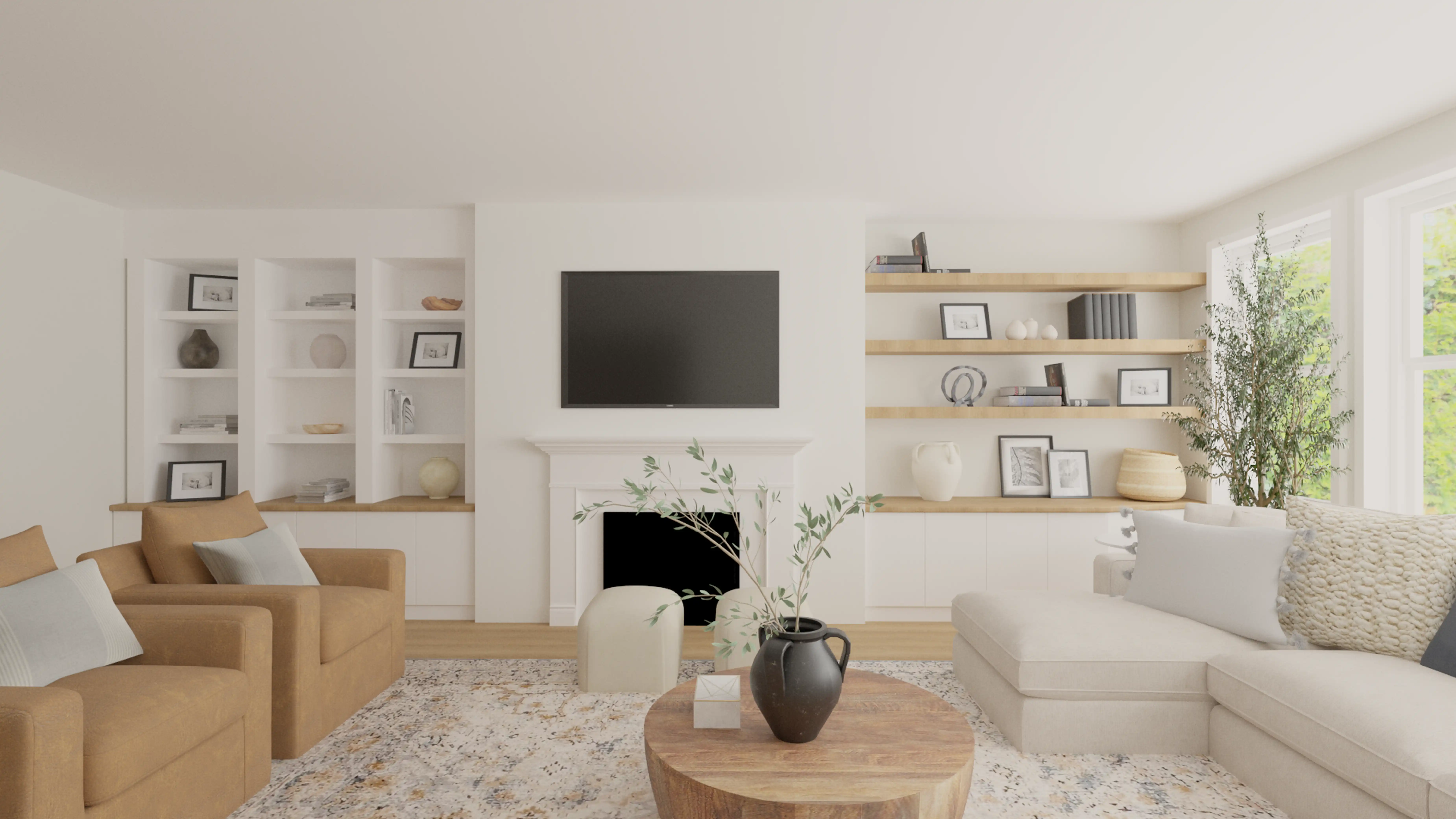 For this room, Amanda selected wall shelves, ledges, and coffee tables from Pottery Barn, McGee, and Co. Discover Furniture design inspiration on Havenly.