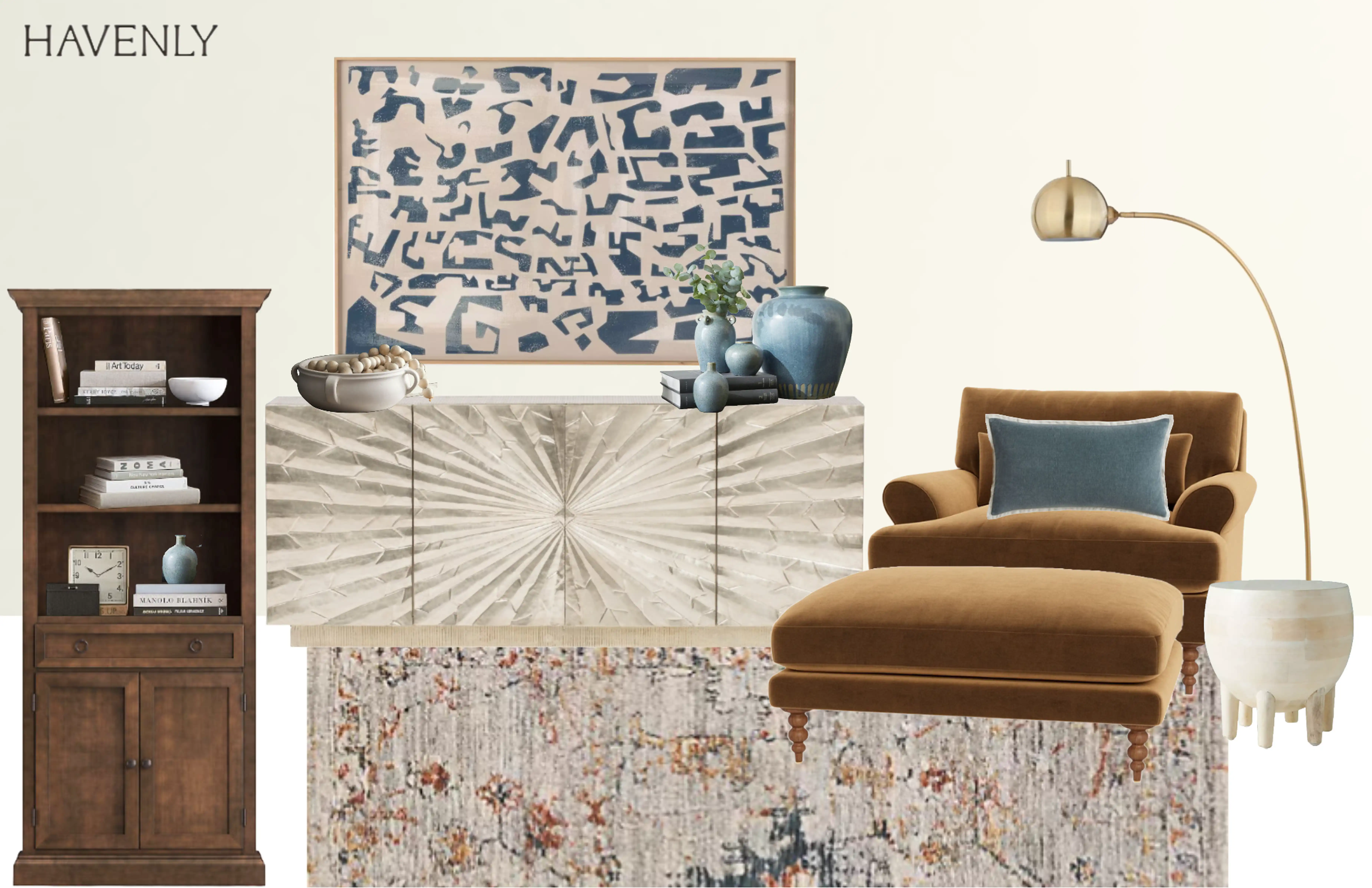 No room is complete without posters, prints, visual artwork, and vases! Mixing up wood, rustic walnut, and textured fine paper with blue, rustic 25 walnut, and textured fine art paper helps to add the finishing touches to the Reading Room. Discover Decor & Pillow design inspiration on Havenly.