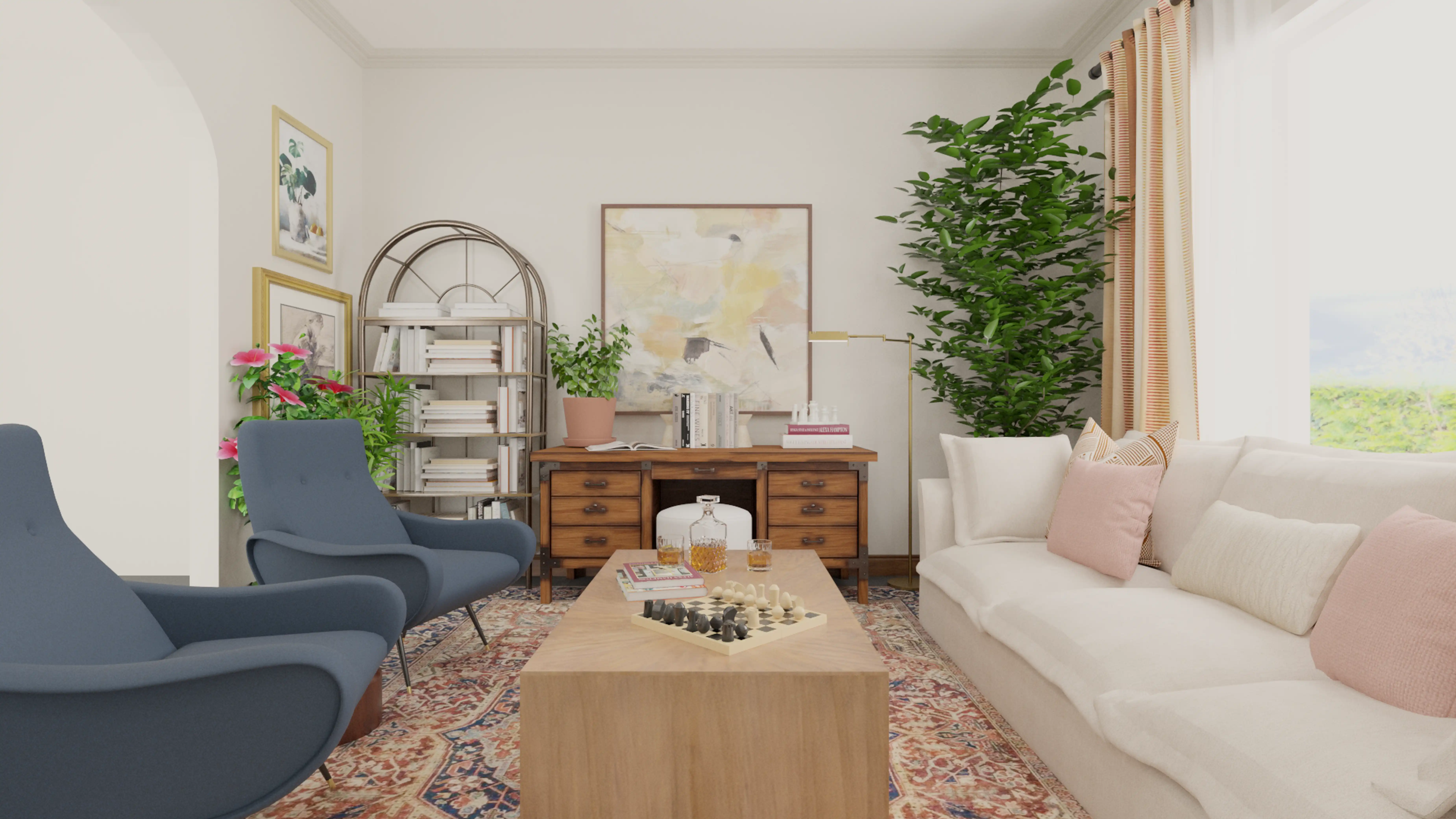 For this Living Room, Andrea selected bookcases, standing shelves, and coffee tables from Creative Co-Op and Rowe Furniture. Discover Furniture design inspiration on Havenly.