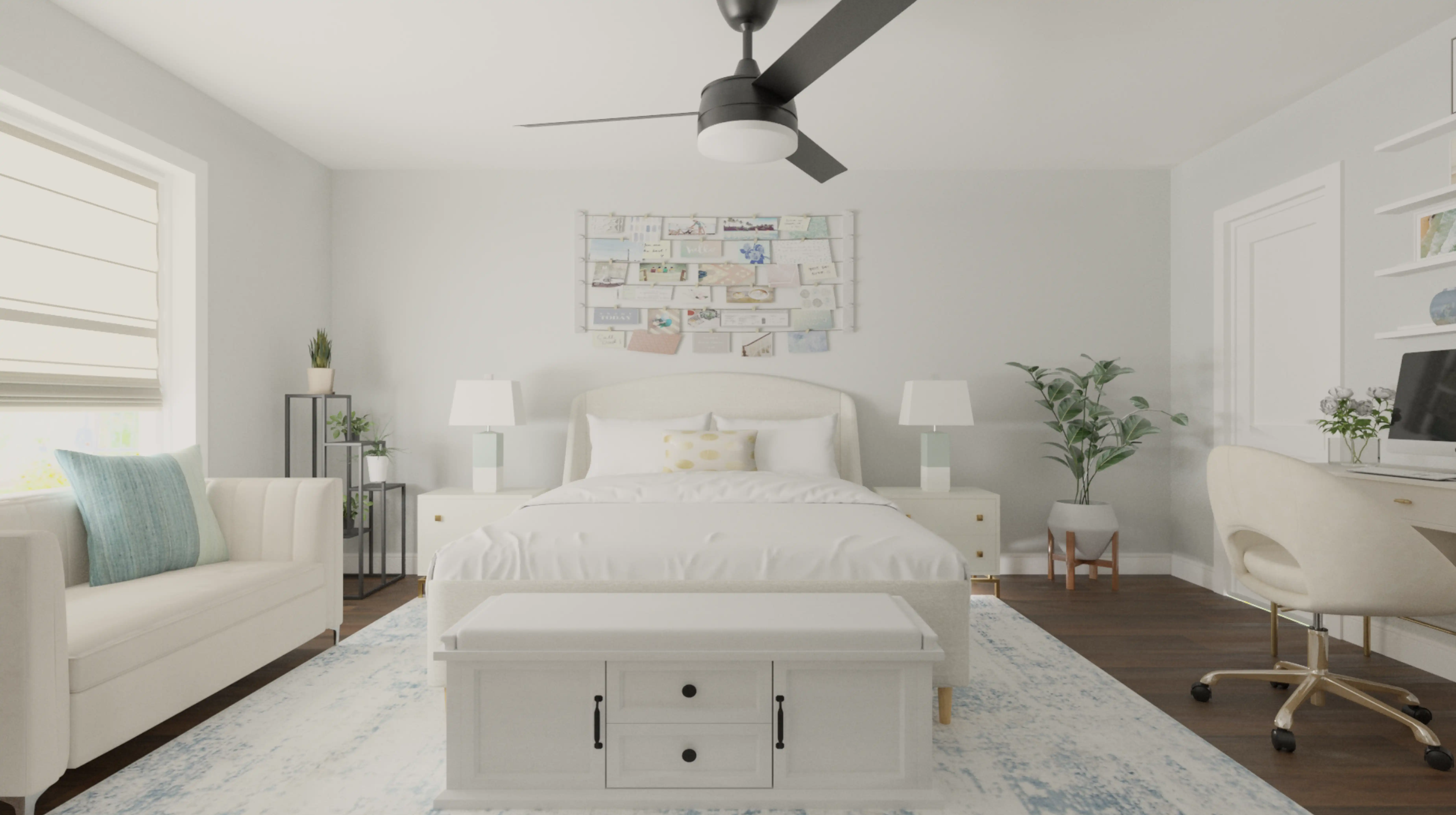 For this Bedroom, Mary selected wall shelves, ledges, and sofas from Wayfair and CB2. Discover Furniture design inspiration on Havenly.