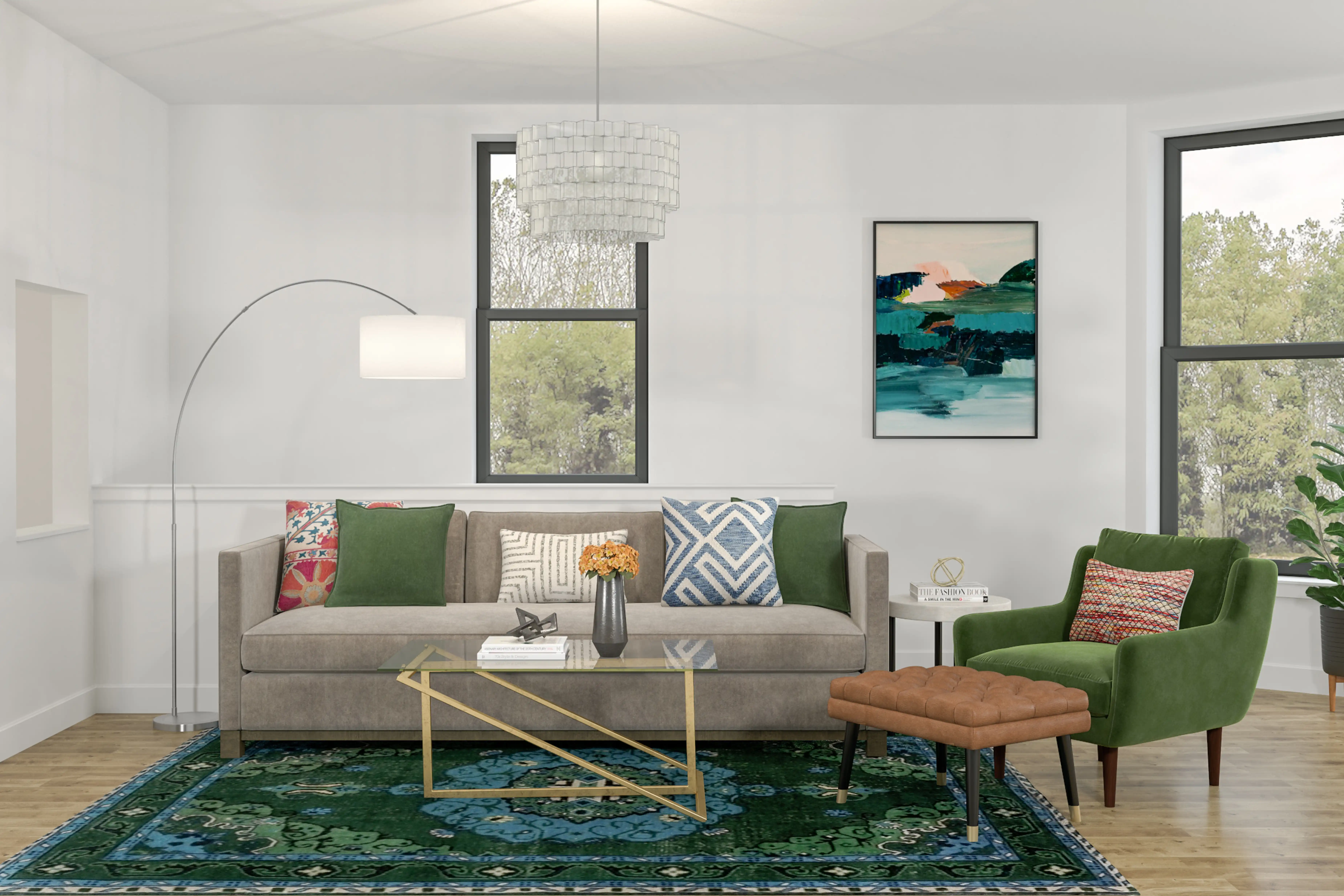 The rug in this space from Anthropologie helps add a variety of colors to the room. Discover Rug design inspiration on Havenly.