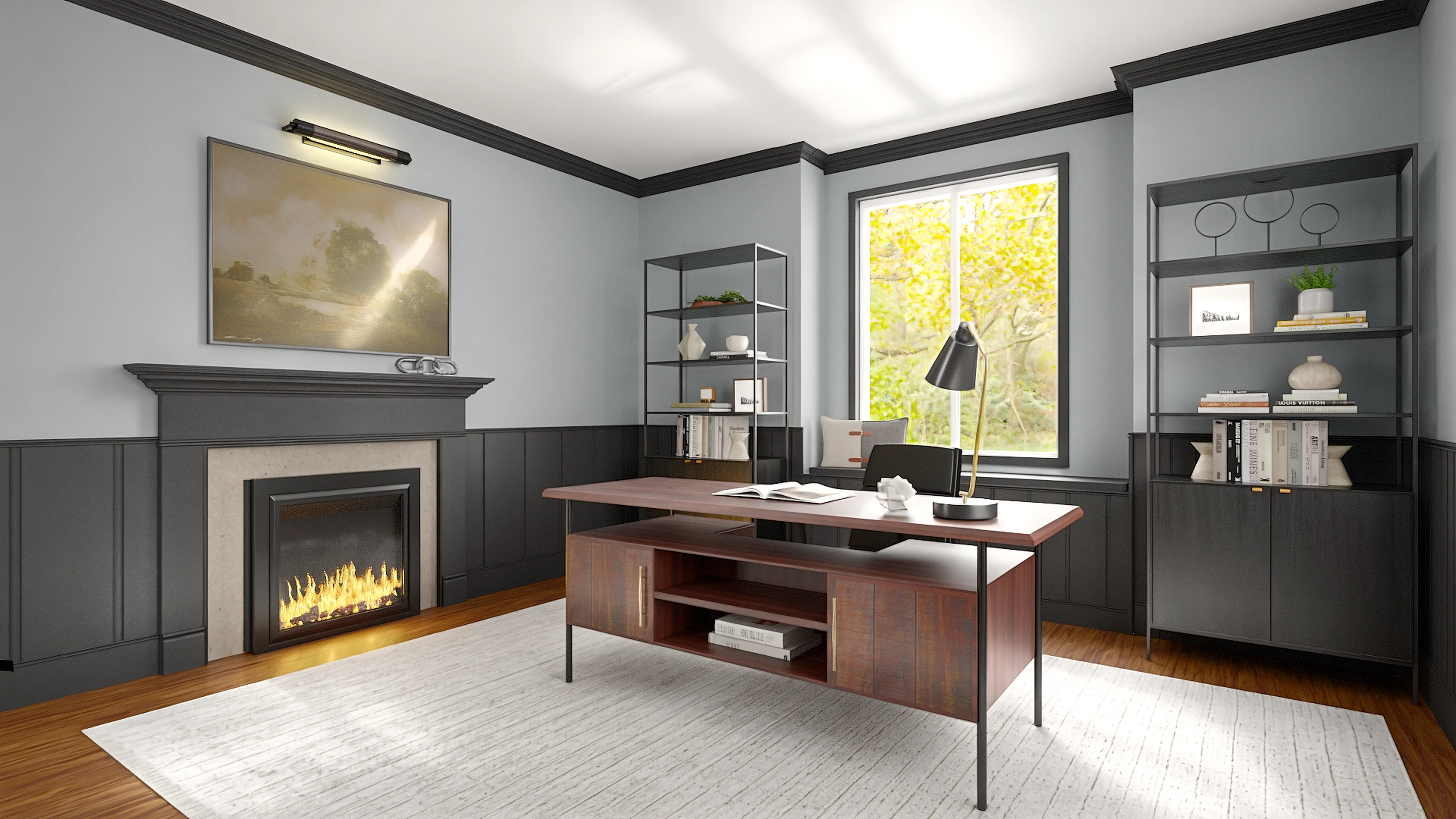 For this Office, Tracy selected desks, bookcases, and standing shelves from Four Hands, Crate, and Barrel. Discover Furniture design inspiration on Havenly.
