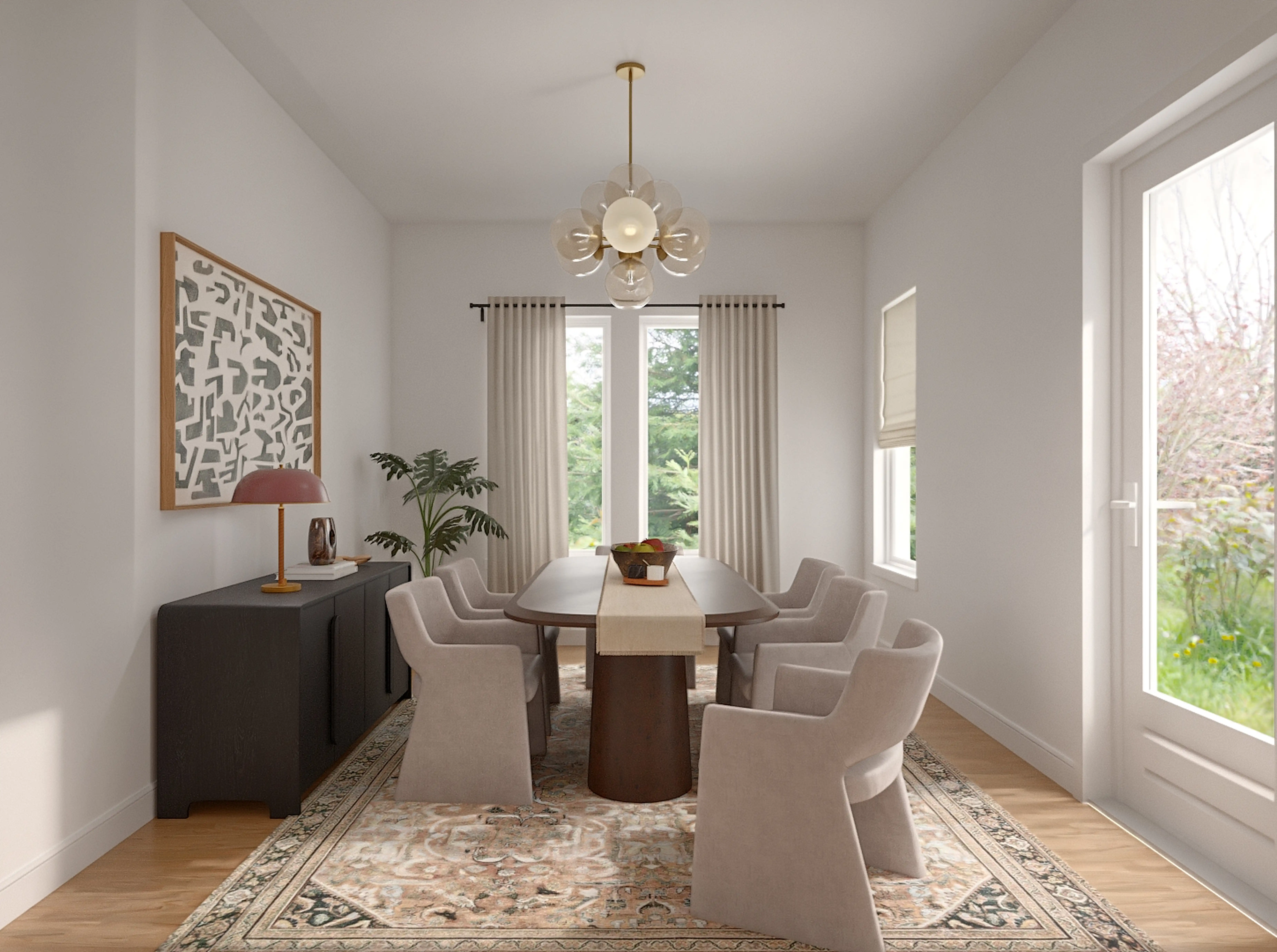 No room is complete without curtain, drape rods, posters, prints, and visual artwork! Mixing up metal, vertical oak floater, and maple panel with black, vertical grain floater white oak, and maple panel helps to add the finishing touches to the Dining Room. Discover Decor & Pillow design inspiration on Havenly.