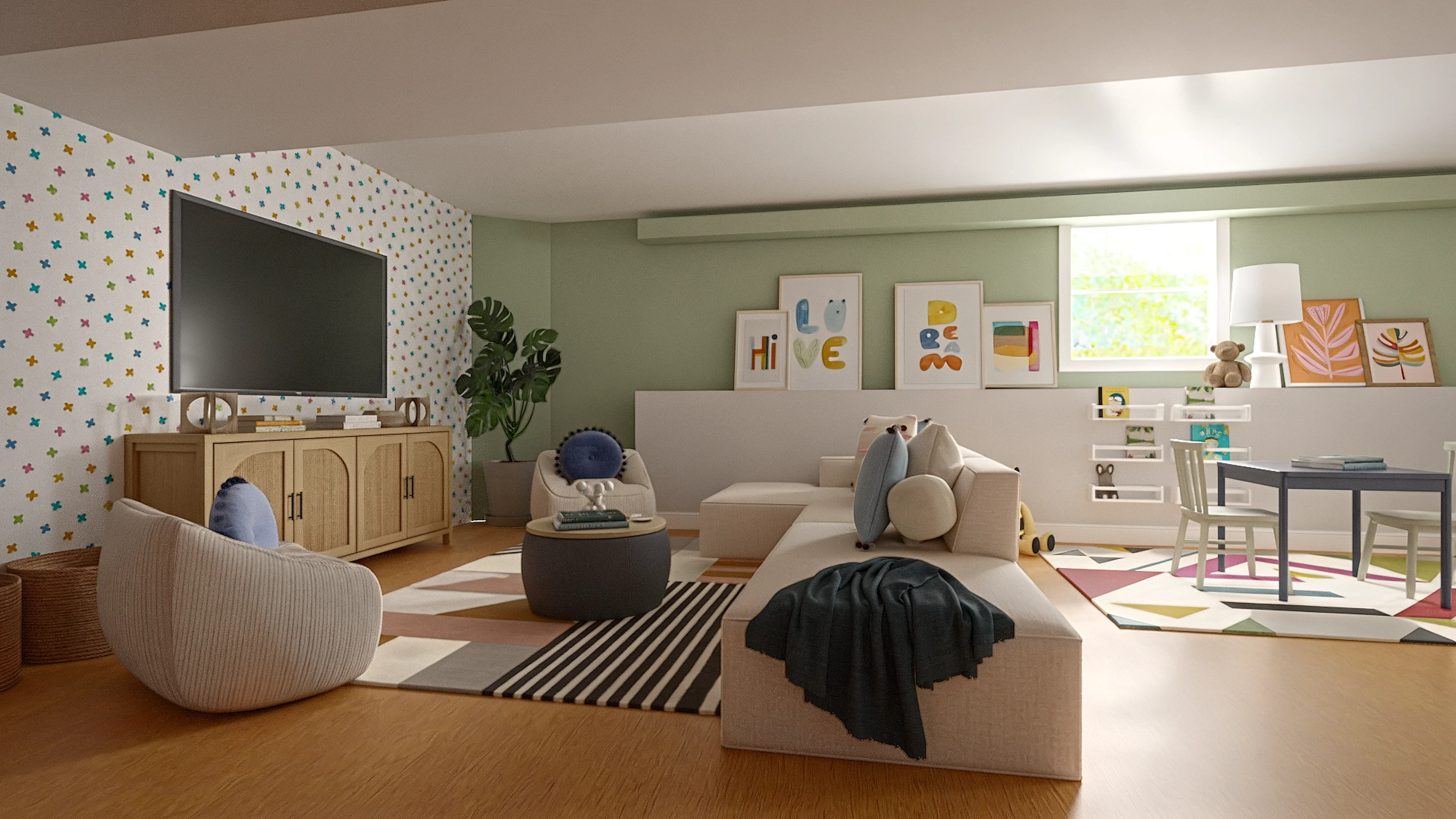 For this room, Barbara selected poufs, wall shelves, and ledges from Crate, Kids, and Wayfair. Discover Furniture design inspiration on Havenly.