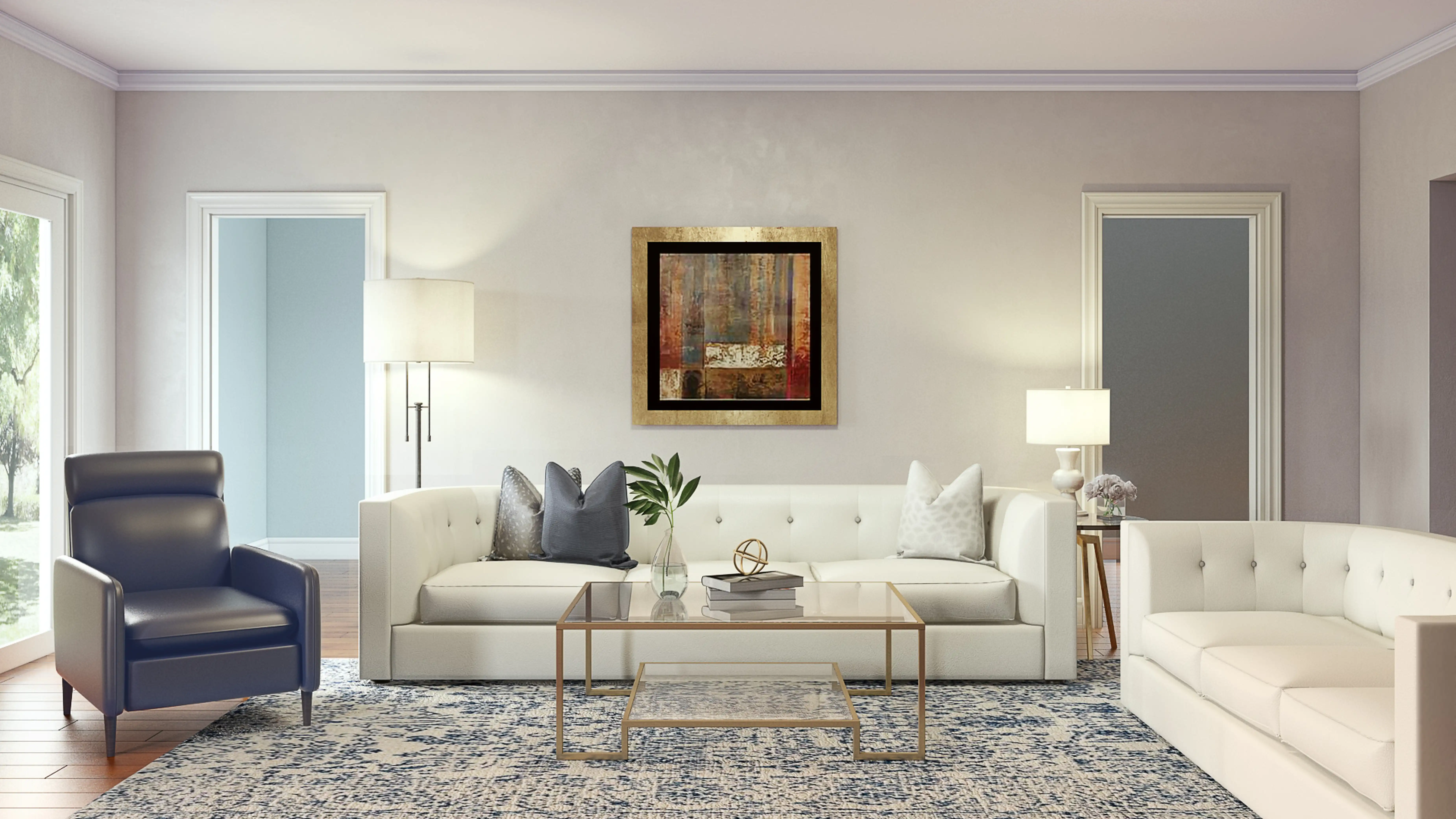 This classic living room is a perfect example of elegance and luxury. The color white dominates the room, but the designer also added a touch of gold with the coffee table and the painting. The black armchair adds some contrast, yet it fits in greatly.