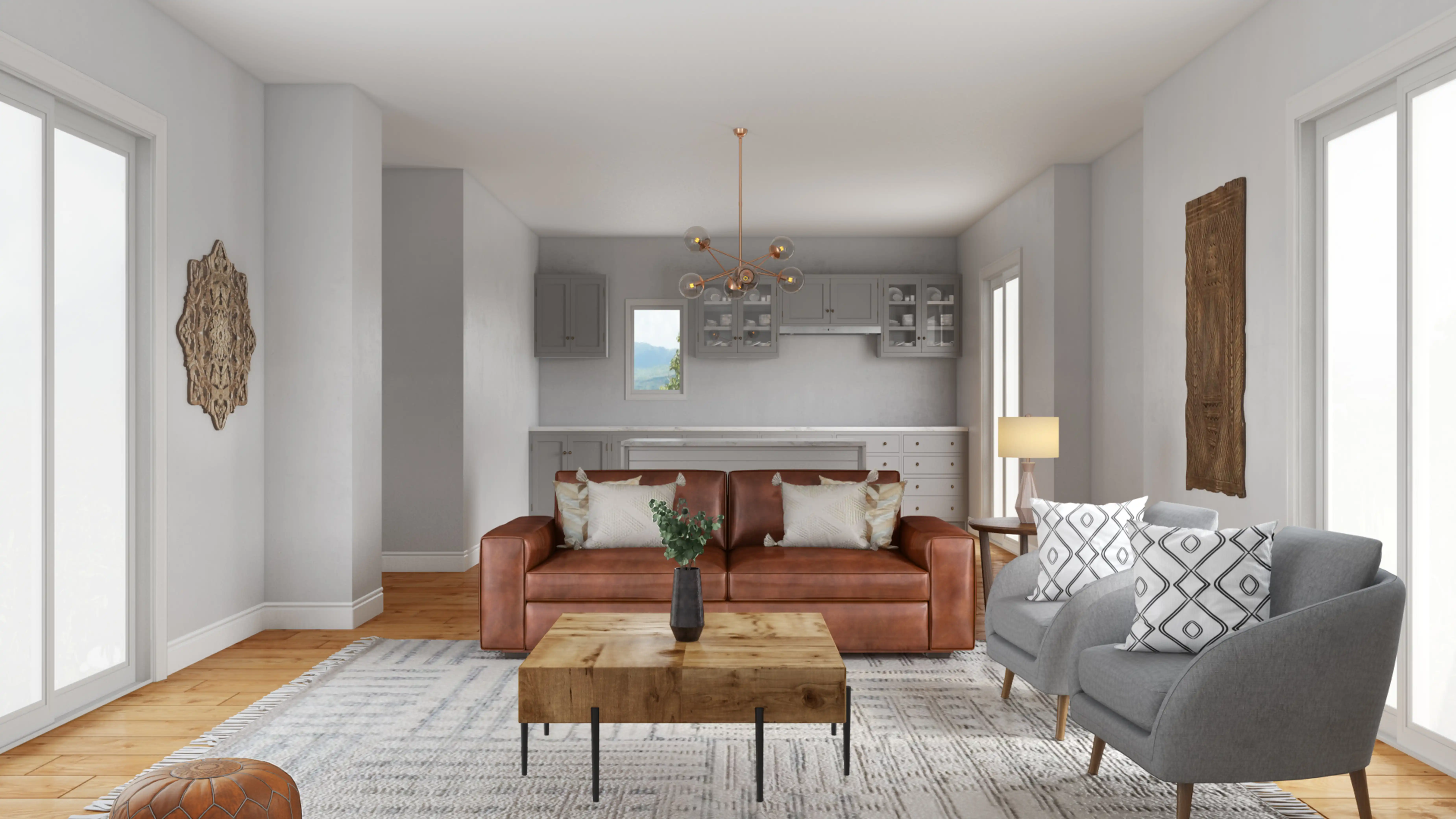 For this Living Room, Talia selected poufs, kitchen, and dining room chairs from West Elm and AllModern. Discover Furniture design inspiration on Havenly.