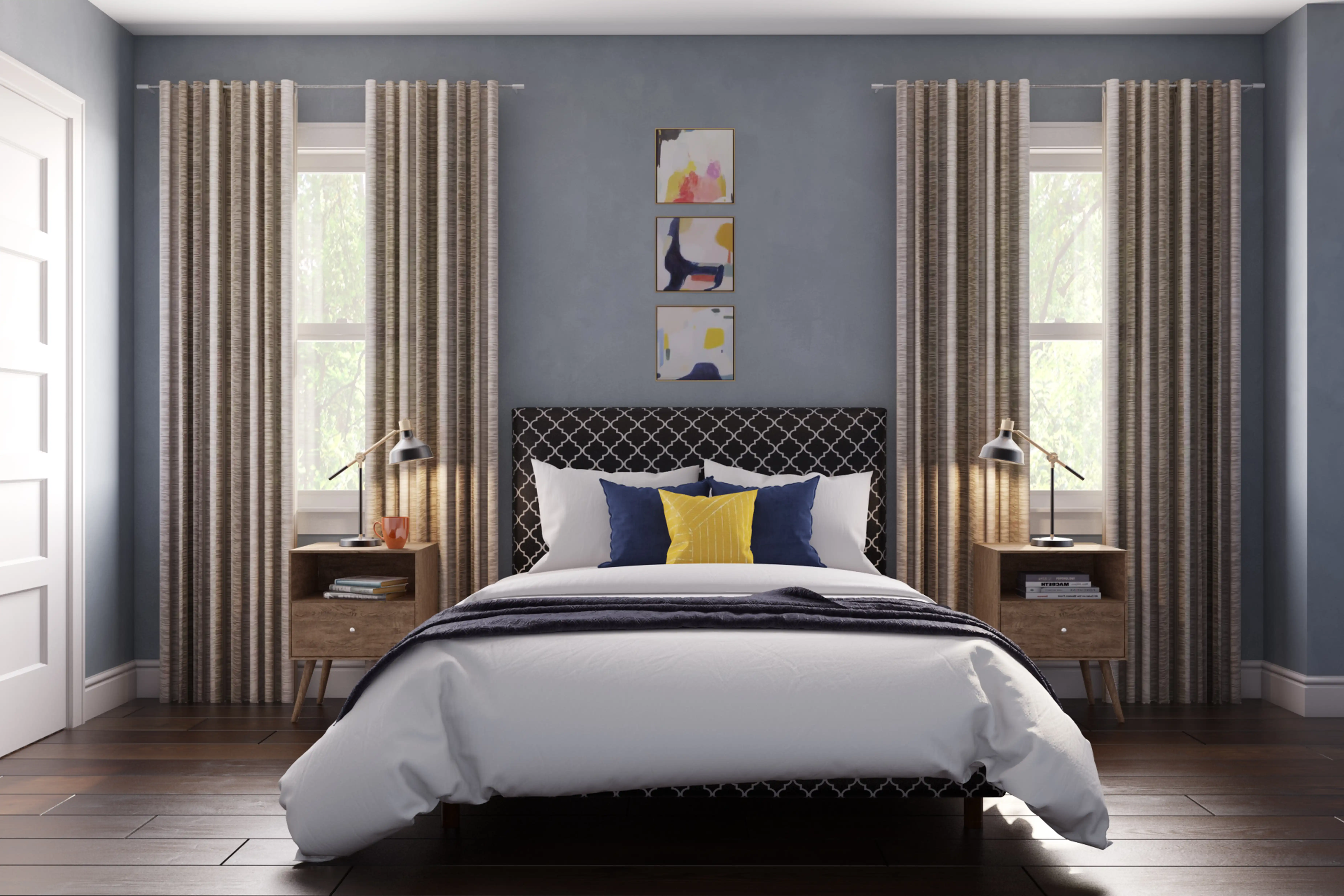 No room is complete without throw pillows and home decor decals! Mixing up velvet and vinyl decal with blue and black helps to add the finishing touches to the Bedroom. Discover Decor & Pillow design inspiration on Havenly.
