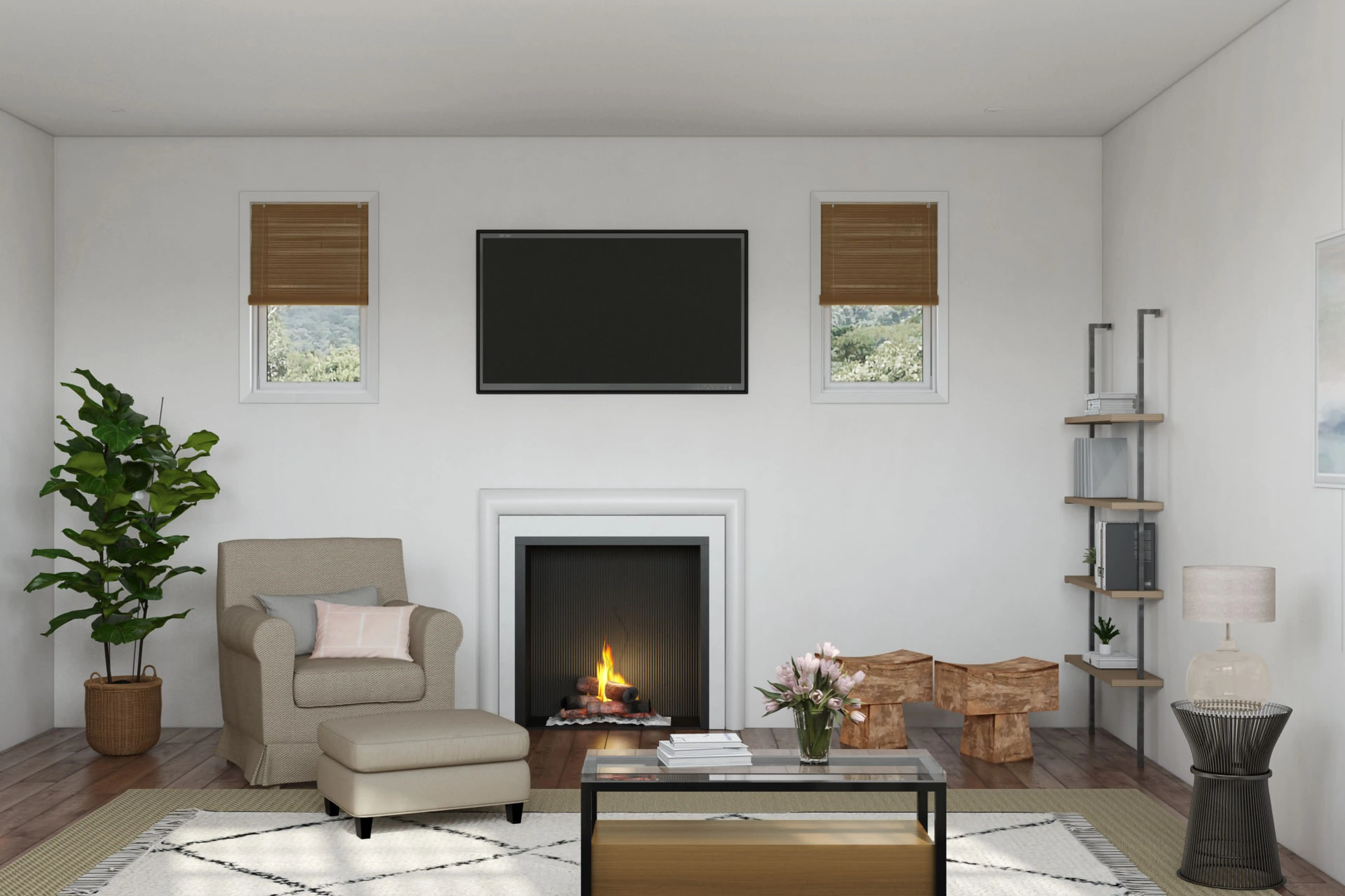 For this room, Rafaela selected end tables, folding chairs, and stools from Home Depot and Wisteria. Discover Furniture design inspiration on Havenly.