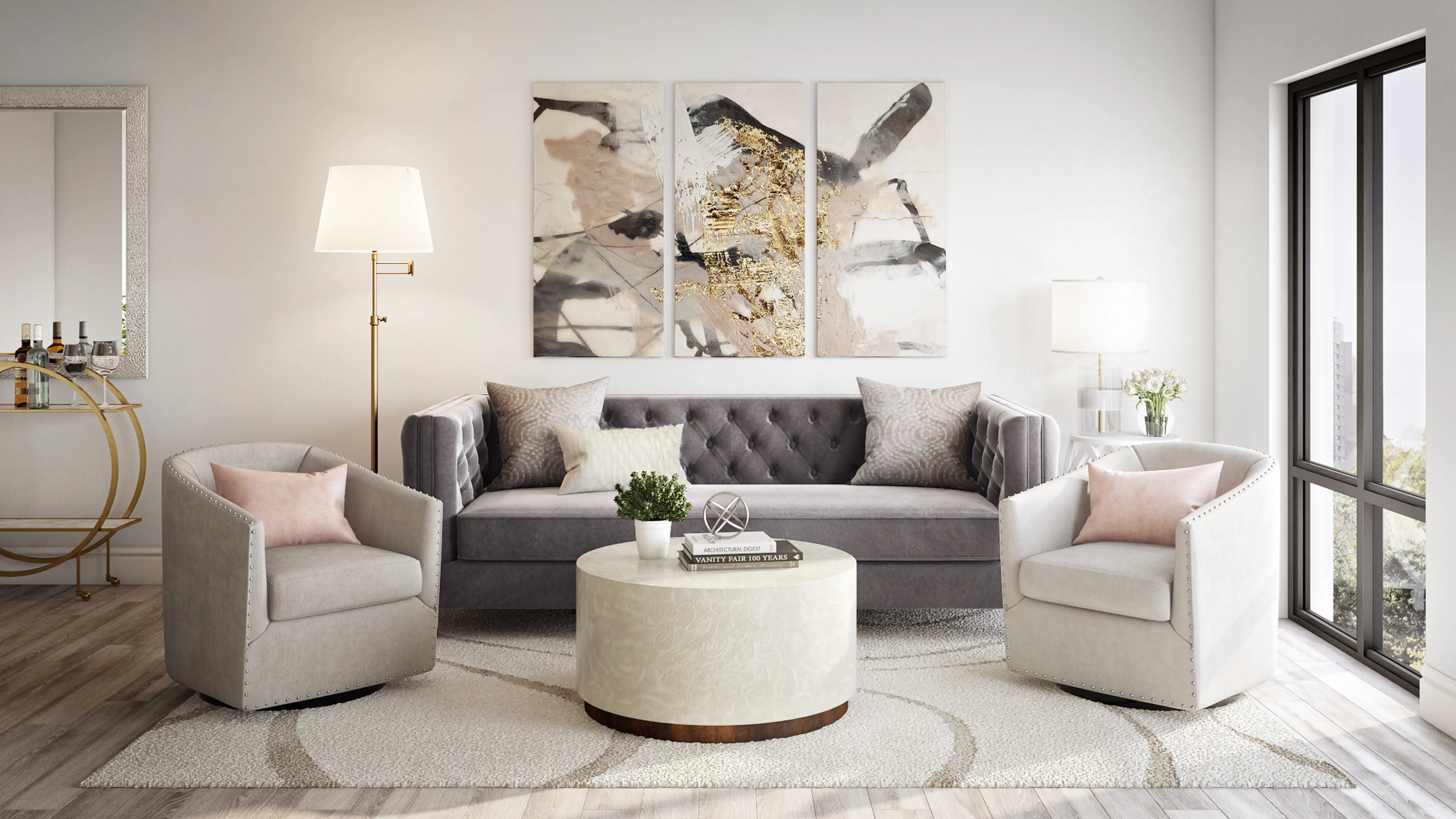For this Living Room, Christine selected accent tables and sofas from Safavieh and TOV FURNITURE. Discover Furniture design inspiration on Havenly.