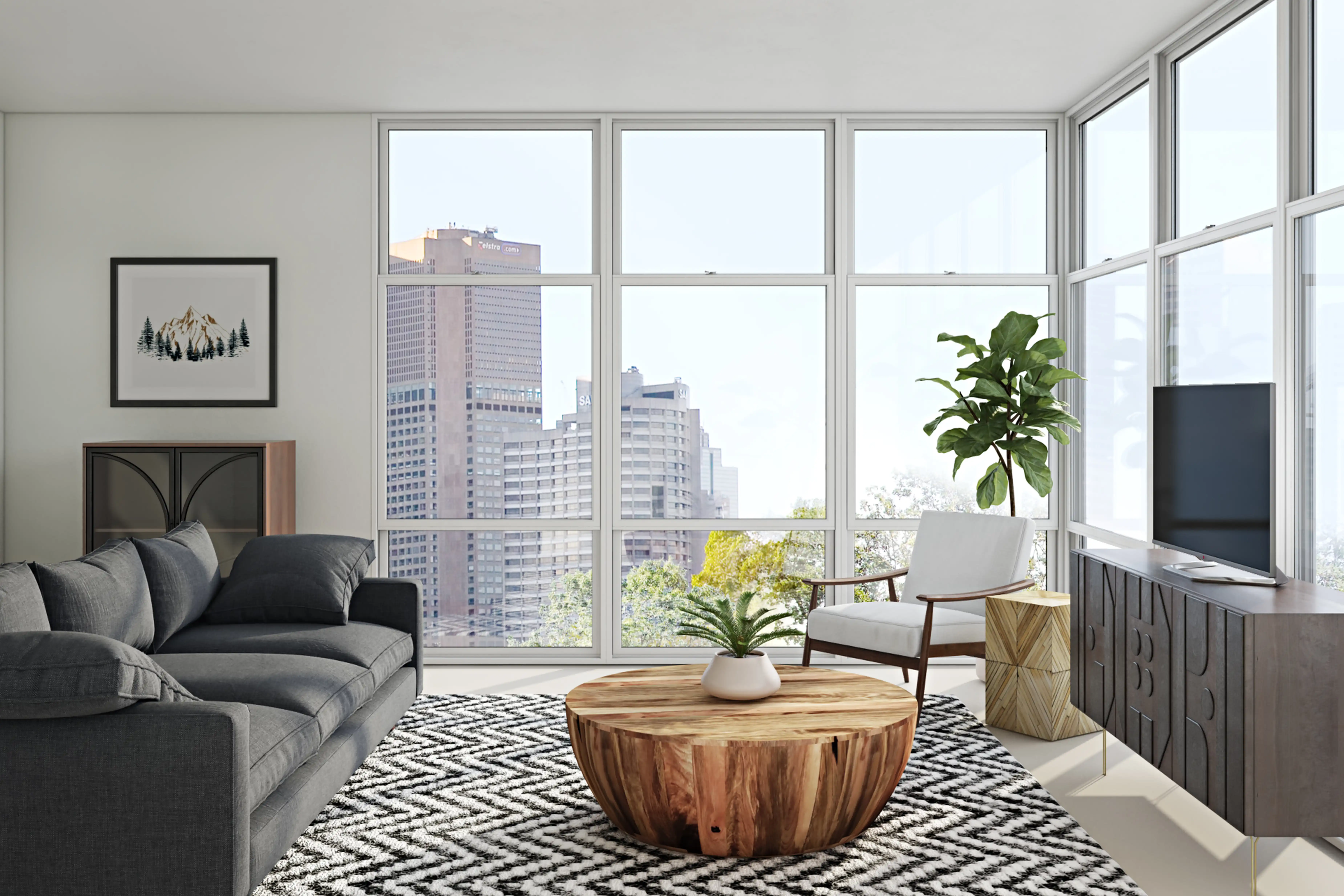 A pictograph wood buffet with Y-shaped metal legs, complemented by a Midcentury black and brass floor lamp, draws the eye in this Scandinavian-style living room. The soft clean lines of the grey sectional sofa and cream lounge chair add modern touches.