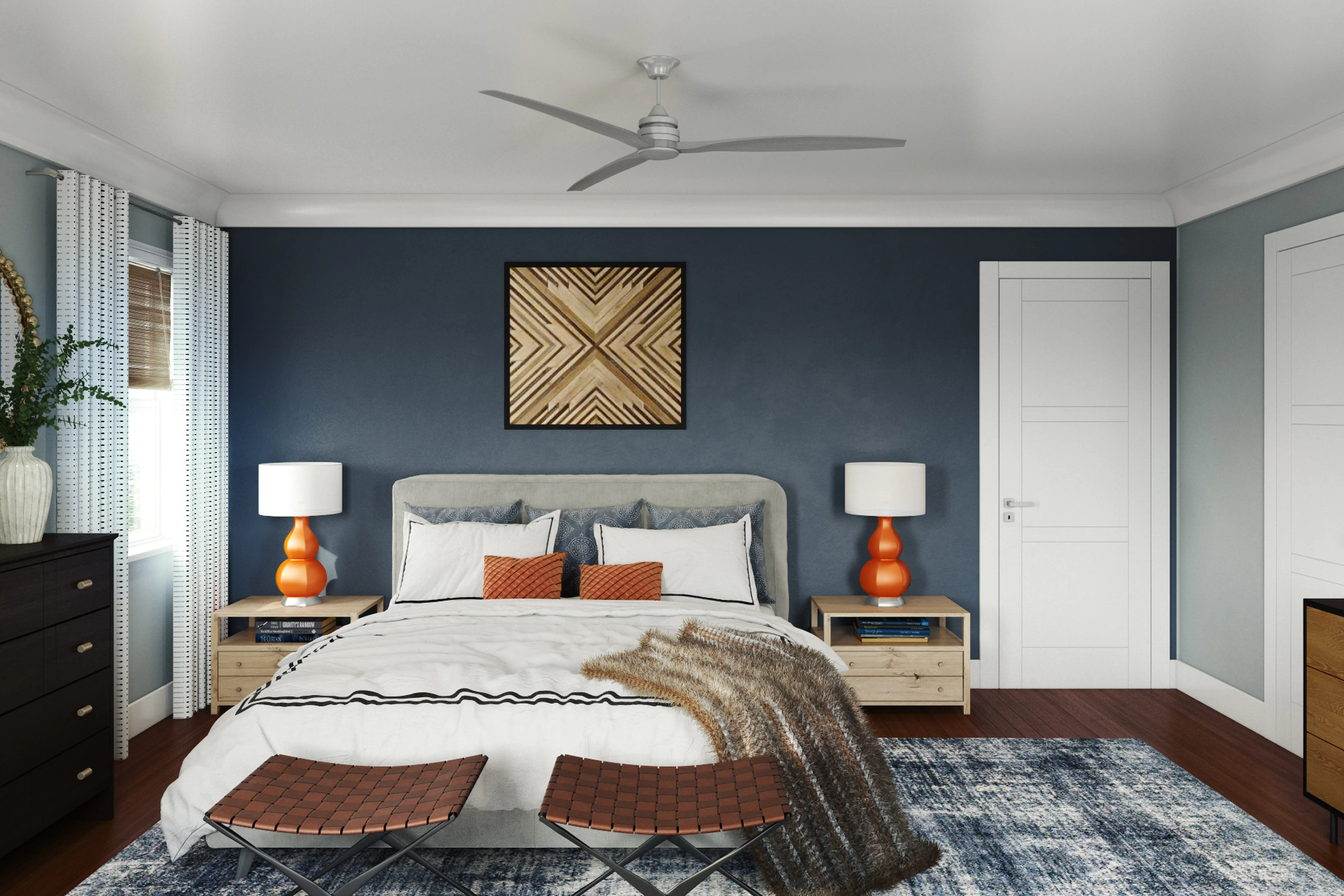 This Contemporary bedroom features a light grey bed layered with decorative pillows. The wood nightstands, dark brown dresser, and leather stools add some warmth. The navy rug and accent wall add a pop of bold color to the design.